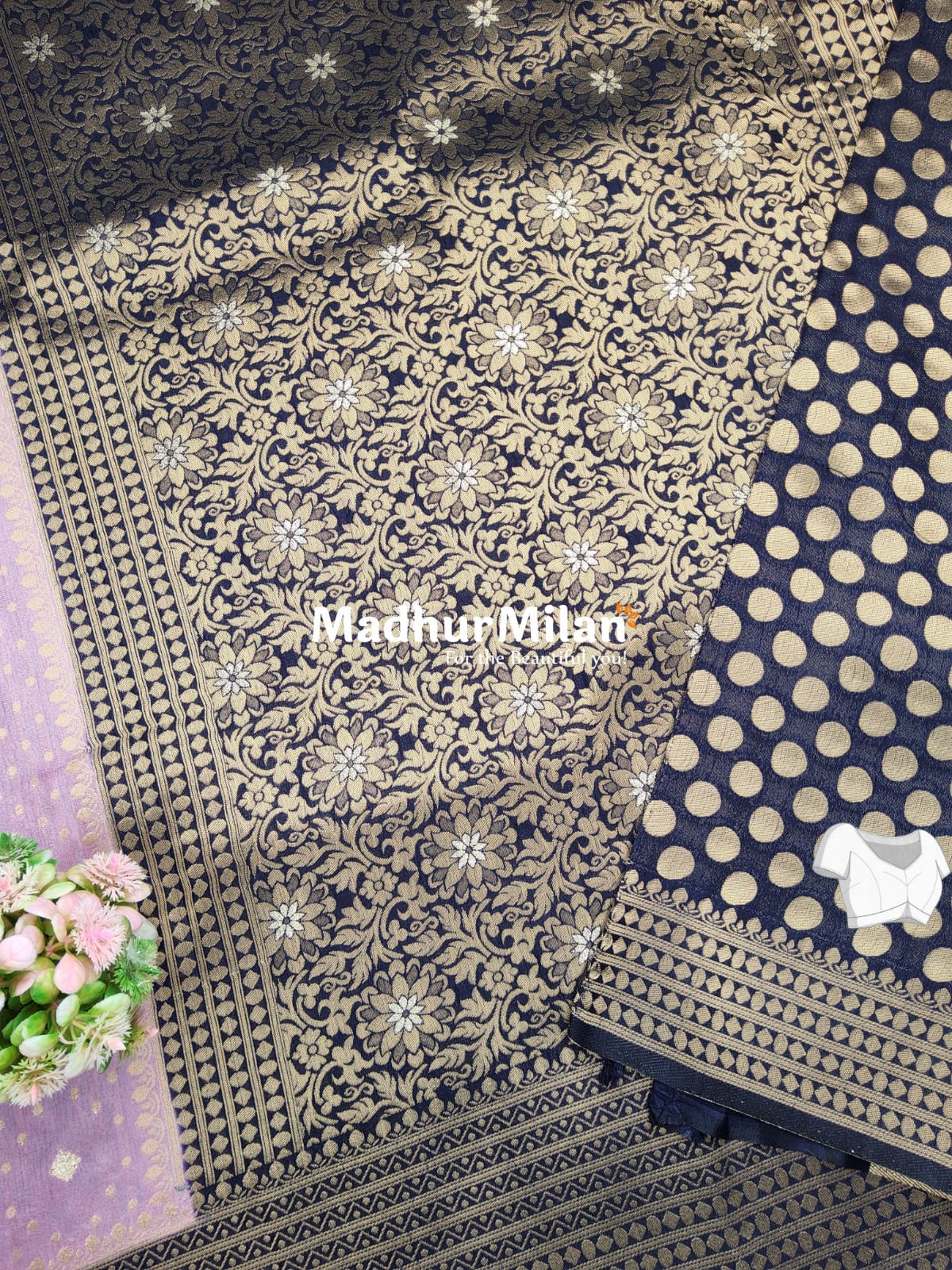 Description: Elevate your ethnic wardrobe with the exquisite INAAYA BANARASI BLOOMS SAREE in a stunning combination of lilac and navy blue. This masterpiece from Madhur Milan is a perfect blend of traditional craftsmanship and contemporary design.