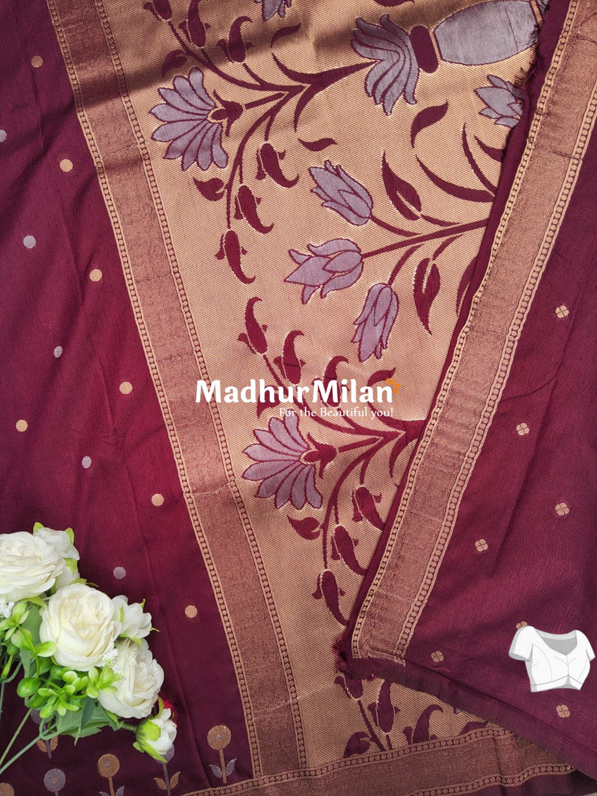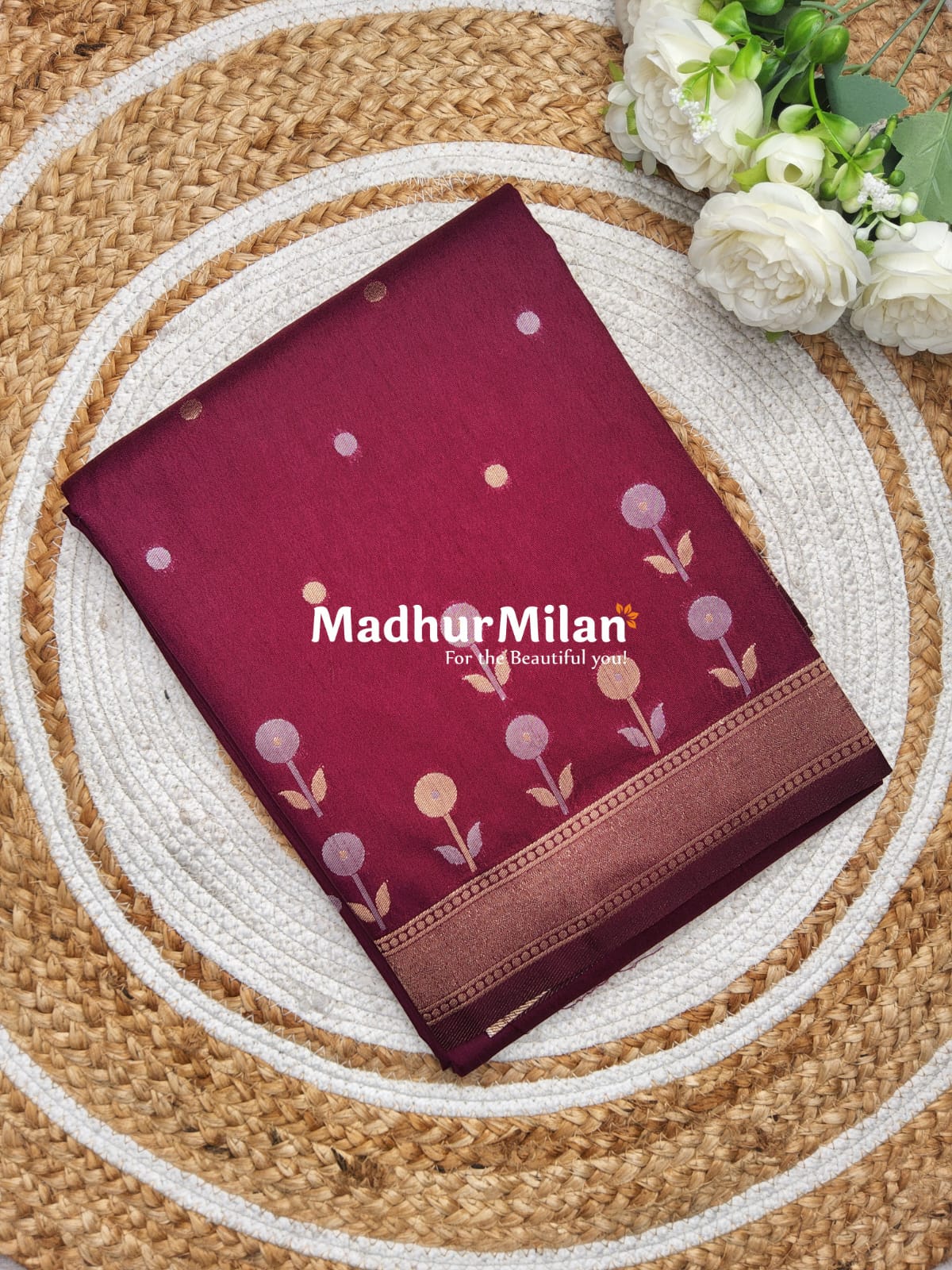 Description: Indulge in the luxurious elegance of our Sunflower Malai Silk Saree in a rich wine color. This exquisite saree from Madhur Milan is designed to make you feel beautiful and confident for any occasion.