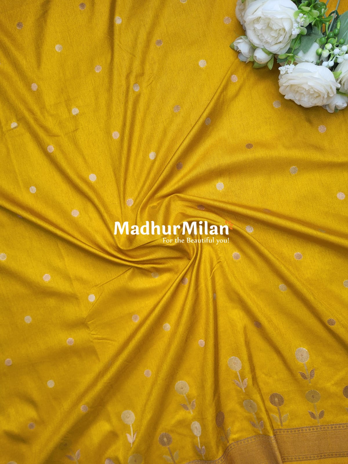3. Design: - Body adorned with delicate golden polka dots and subtle sunflower motifs - Elegant golden border with intricate floral patterns - Pallu featuring exquisite golden thread work in a beautiful floral design Pattern & Embellishments: - The saree body showcases a scattered pattern of small golden dots, creating a starry effect against the yellow background - Lower border and pallu embellished with golden sunflower and leaf designs, adding a touch of nature-inspired elegance.