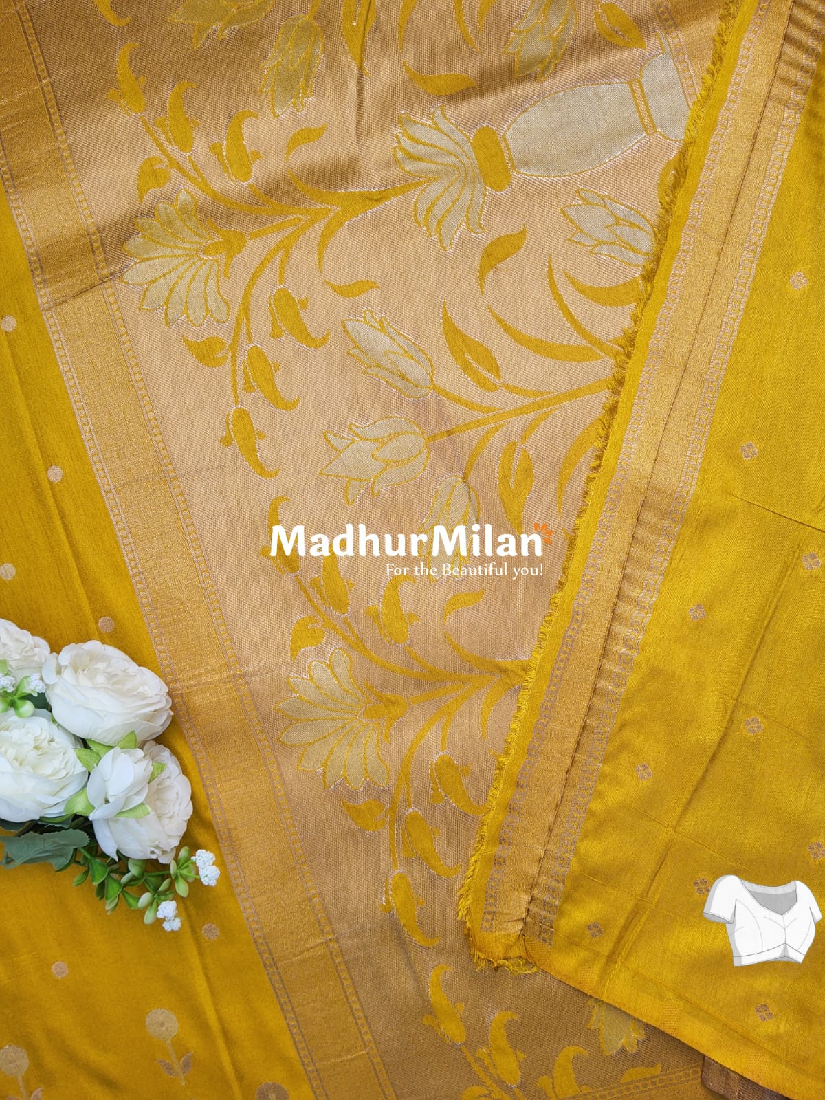 Description: Embrace the warmth of the sun with our exquisite Sunflower Malai Silk Saree in a radiant Golden Yellow. This stunning piece from Madhur Milan is designed "For the Beautiful you!"