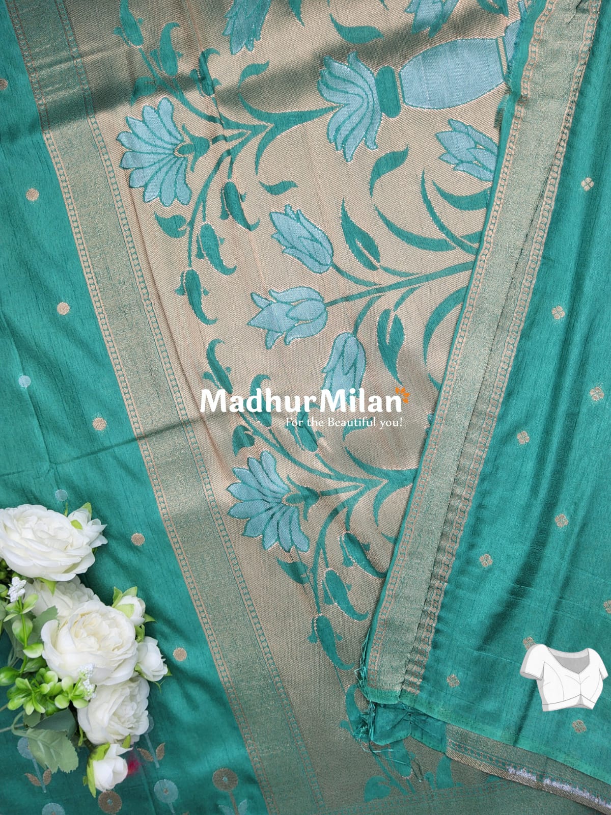 The saree's body features a charming, scattered pattern of sunflower-inspired motifs and polka dots, creating a whimsical yet elegant look. The rich dusty green color is complemented by the shimmering gold and silver accents, adding a touch of glamour to the overall design. The pallu showcases exquisite craftsmanship with its intricate floral patterns, seamlessly blending various shades of blue and green against a golden backdrop. This stunning contrast adds depth and sophistication to the saree.