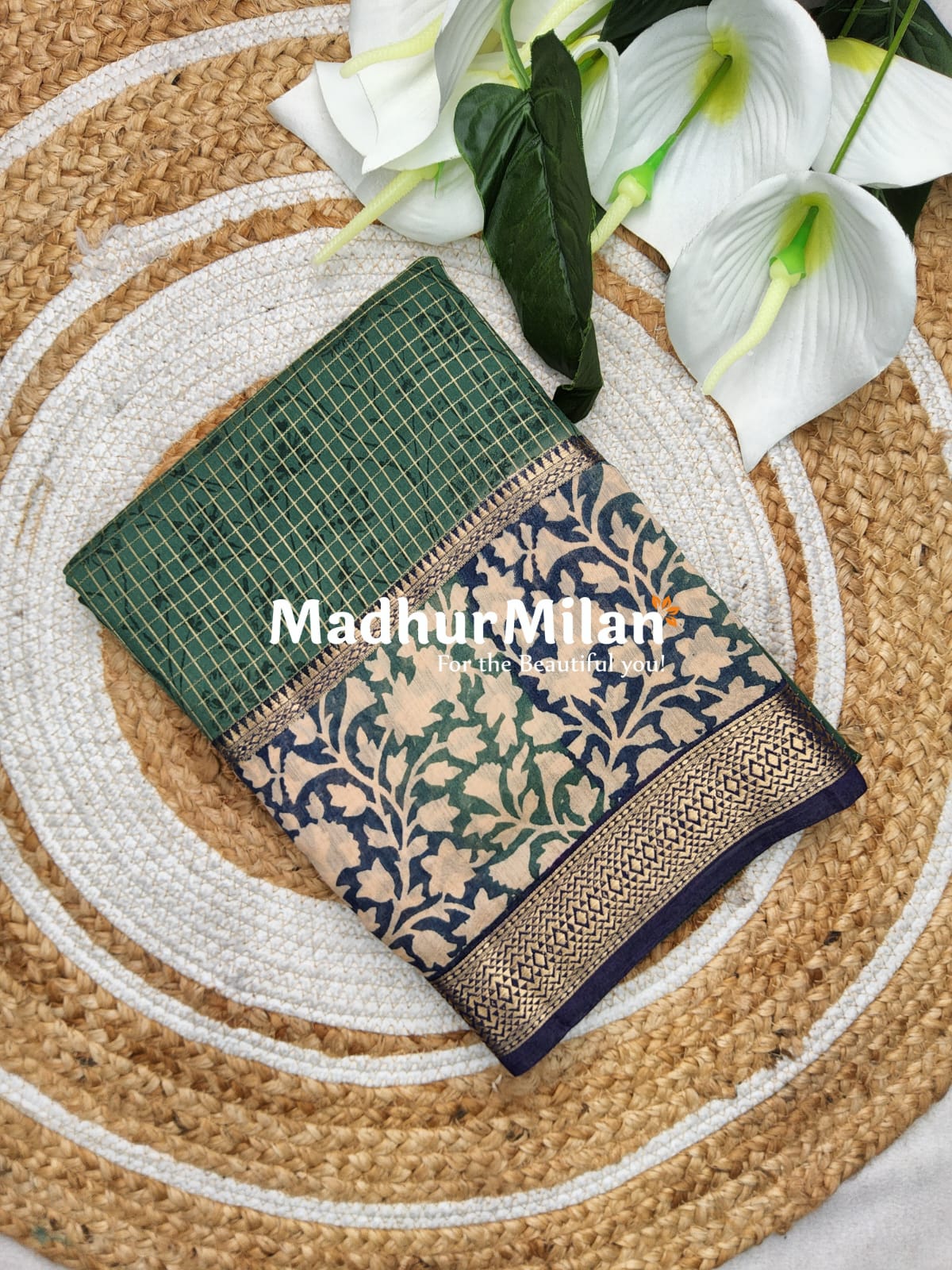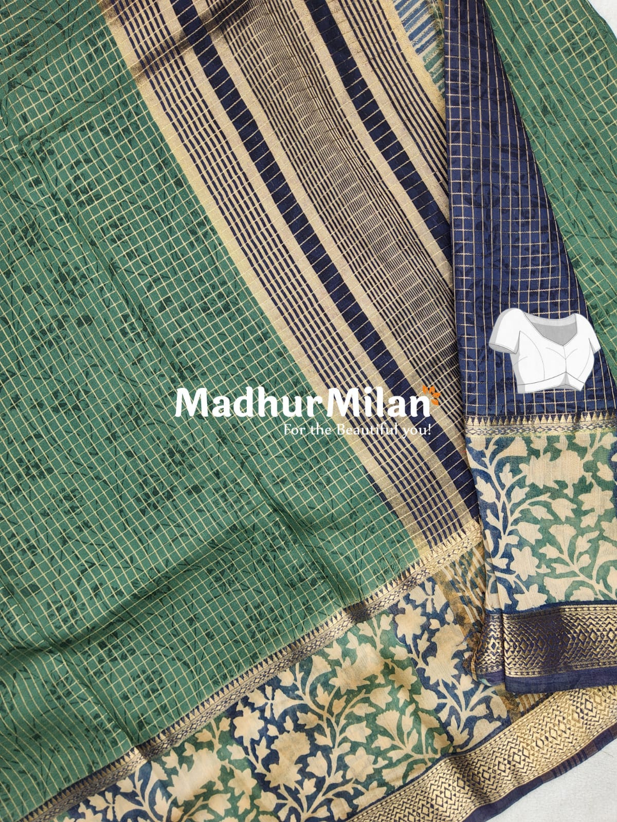 Elements: - The body of the saree features a subtle checkered pattern in green and gold - The border showcases an intricate floral design, reminiscent of traditional Indian artwork - The pallu combines striped patterns with floral motifs, creating a beautiful contrast Styling: - Pair with the included matching blouse piece for a coordinated look - Ideal for festivals, weddings, formal events, or any occasion that calls for elegant ethnic wear - Accessorize with gold jewelry to complement the saree's golden accents