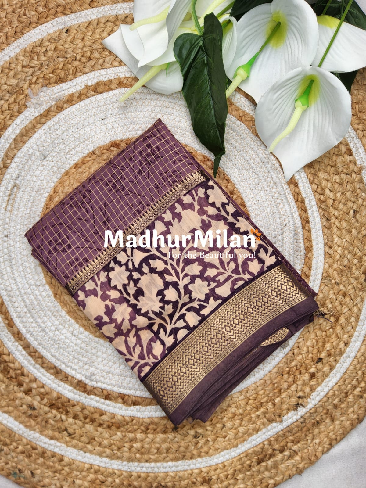 Body: - The main body of the saree features a mesmerizing purple hue adorned with a delicate grid pattern in golden threads - The fabric drapes beautifully, offering both comfort and elegance