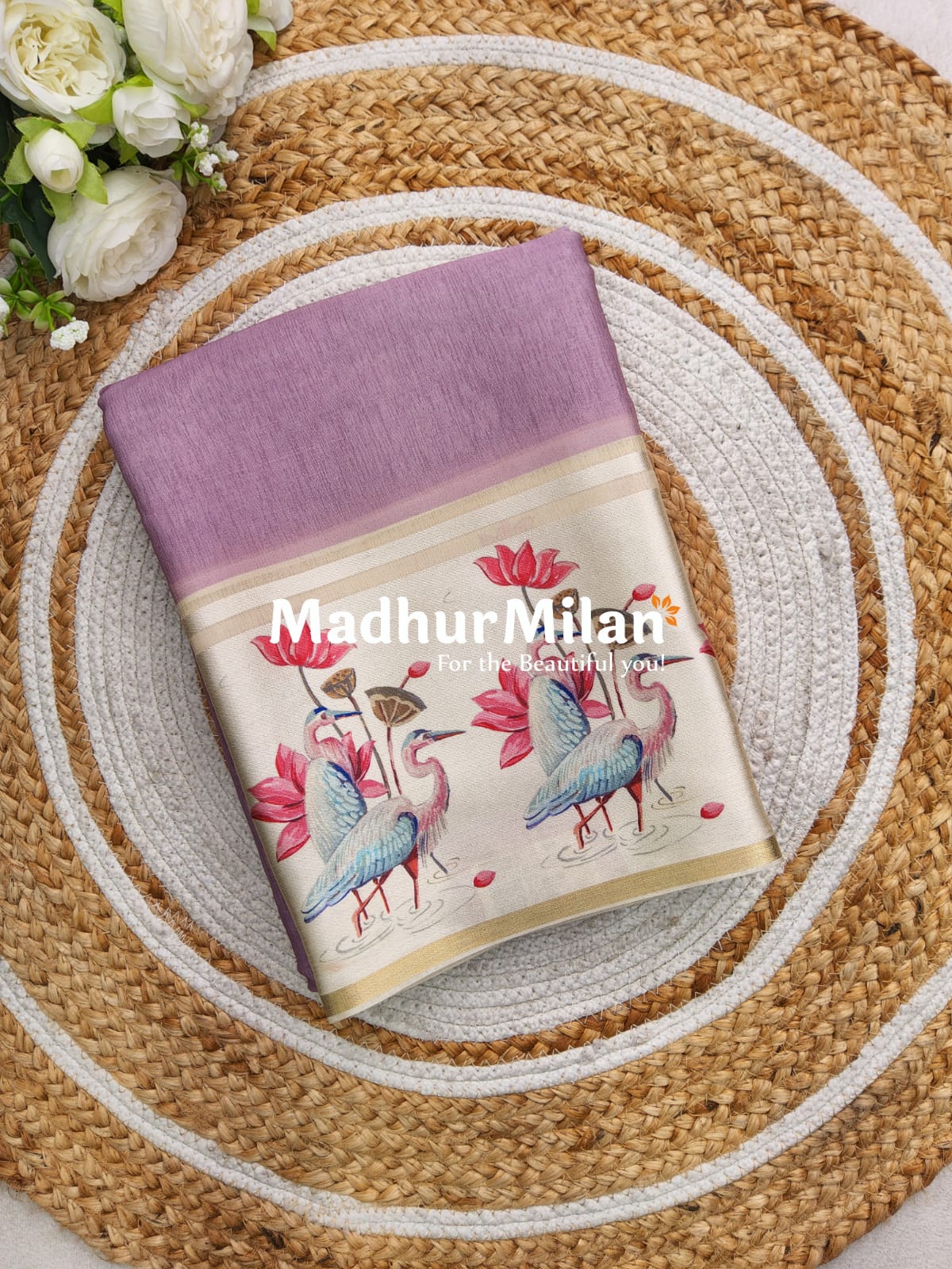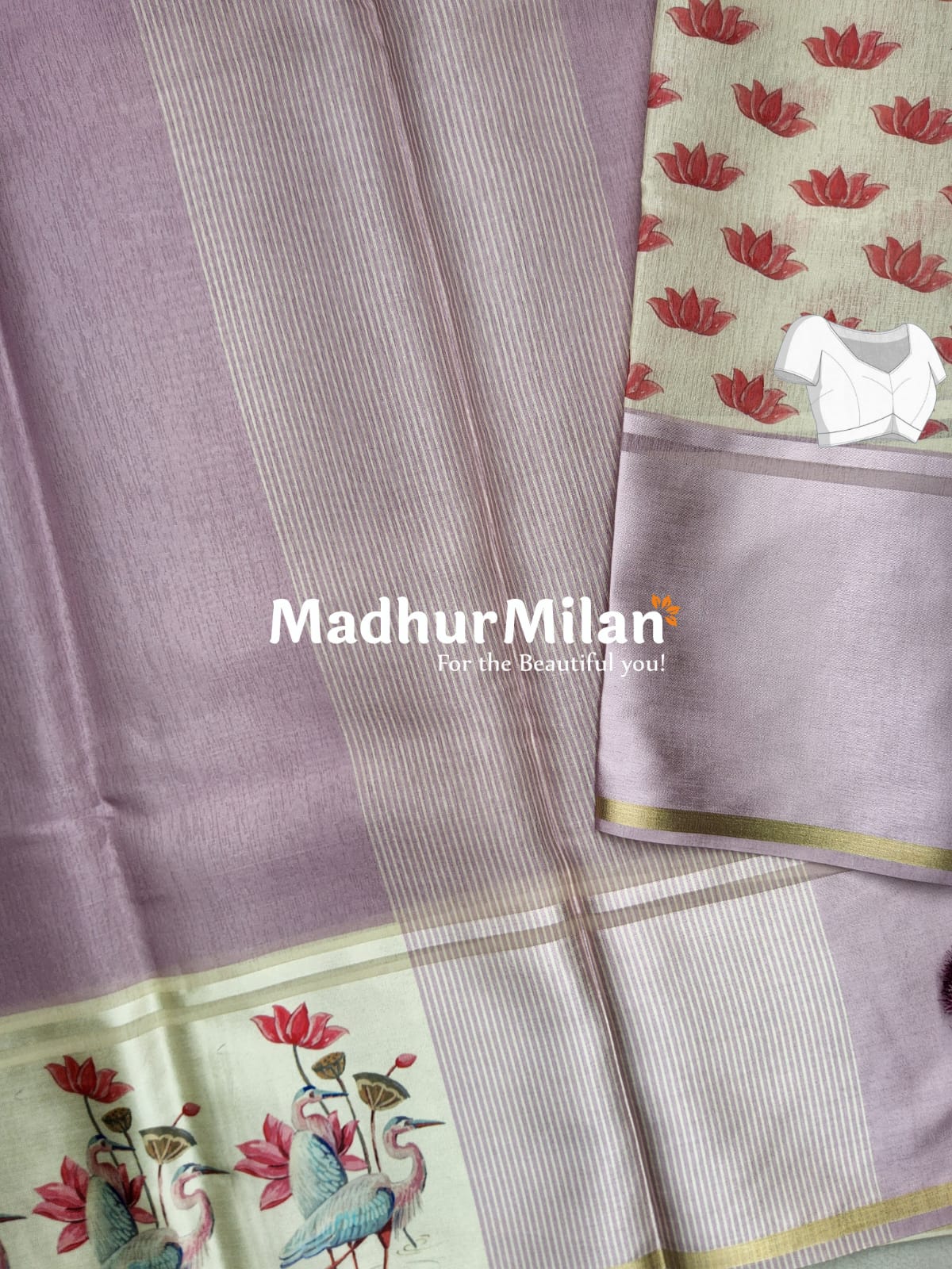 The saree's unique selling point is its stunning printed border, which depicts a serene scene of lotus flowers and cranes. This nature-inspired motif adds a touch of tranquility and elegance to the overall design.