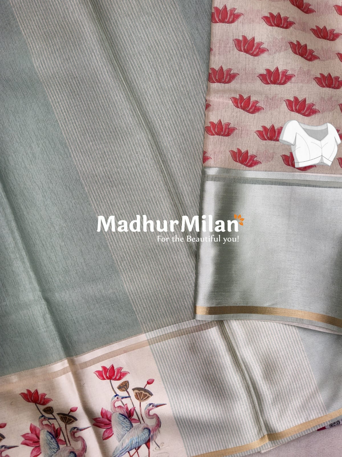 The saree showcases a mesmerizing, printed border that tells a story of nature's beauty. Delicate lotus flowers in rich pink hues bloom alongside serene cranes, creating a harmonious scene that's sure to draw admiring glances. The dusty green body of the saree provides the perfect canvas for this artistic display, allowing the intricate design to truly shine.