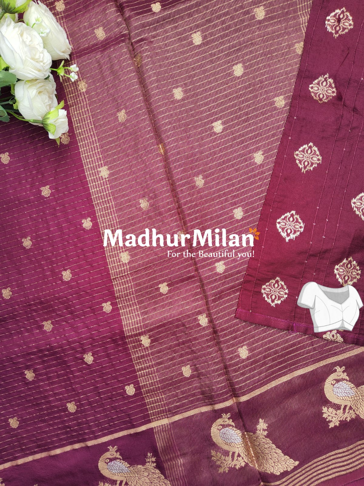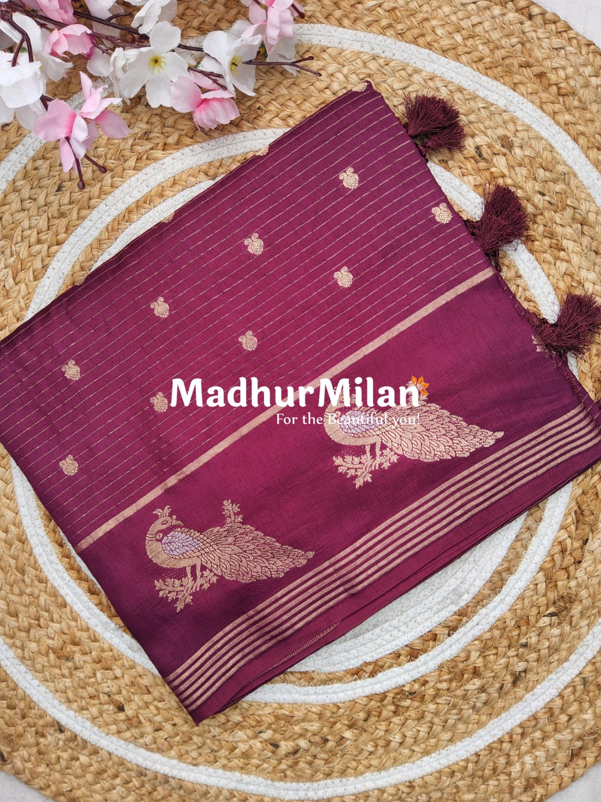 Make a statement at your next event with this exquisite PEACOCK BORDER BANARASI SAREE WINE. Let Madhur Milan bring out the beautiful you!