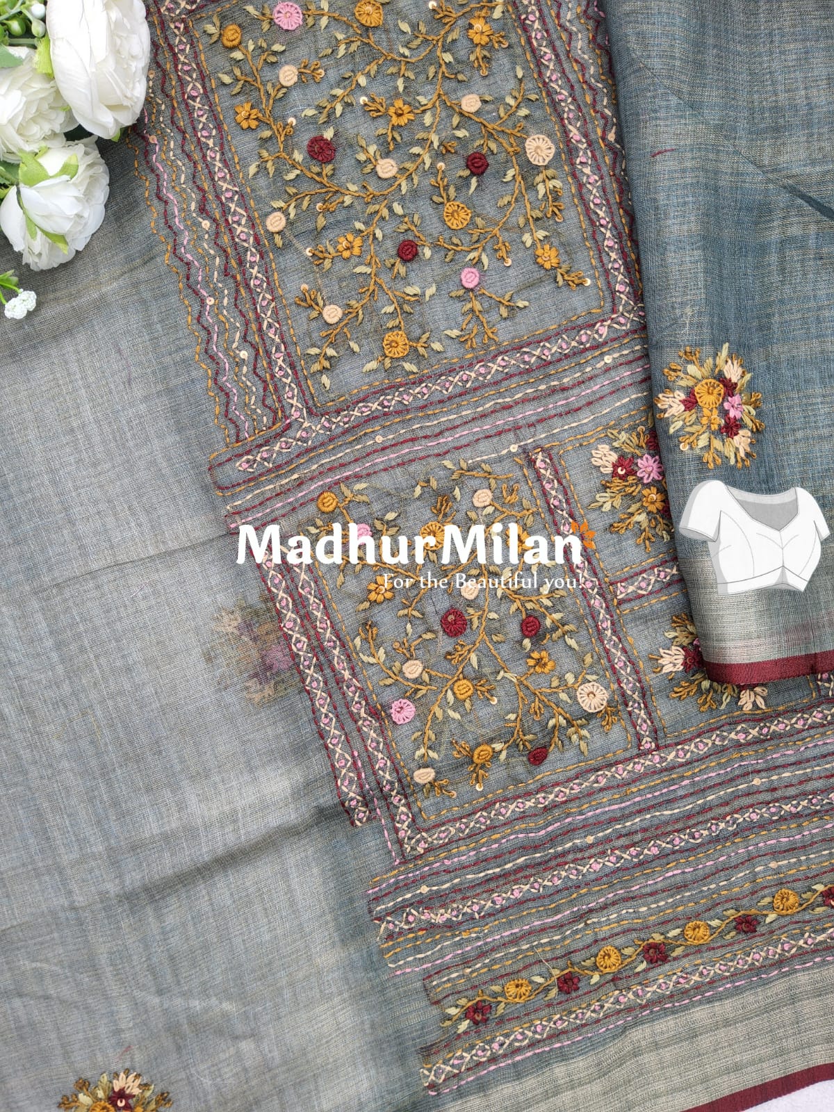 Description: Introducing the exquisite LENIN TISSUE EMBROIDERY WORK SAREE in a sophisticated dusty green shade, brought to you by Madhur Milan.