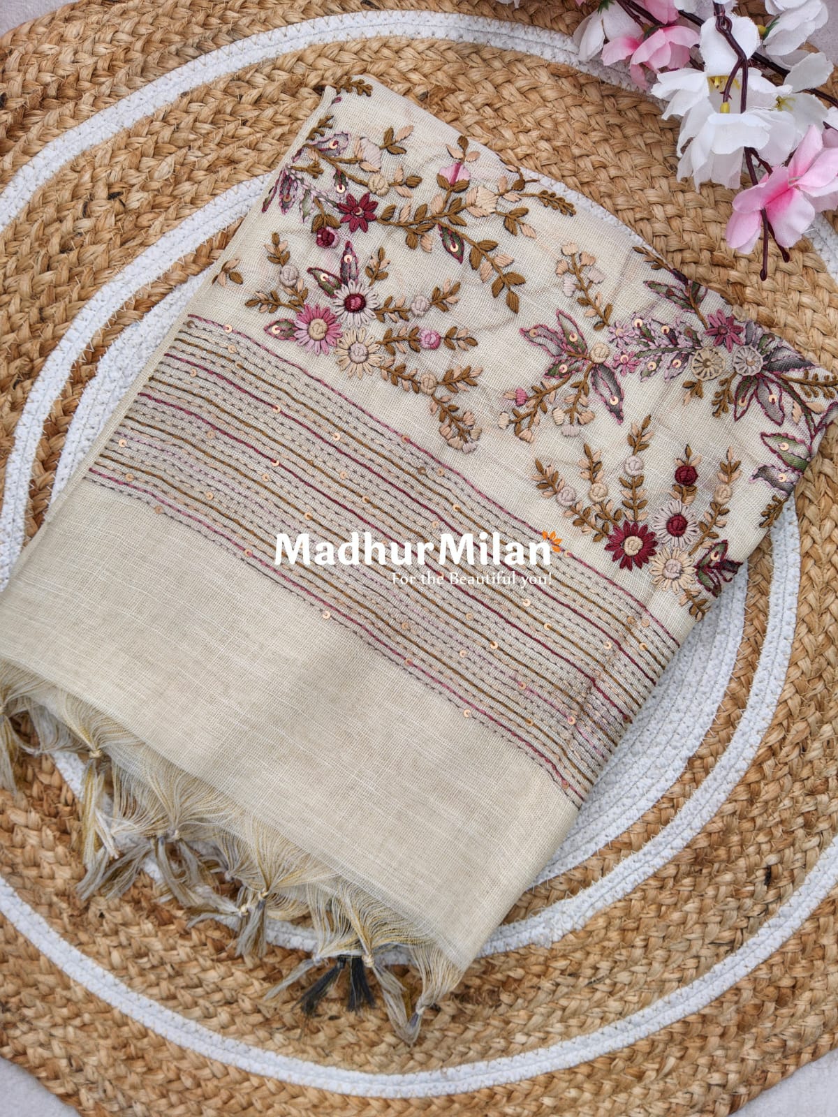 Product Name: LENIN EMBROIDERY WORK SAREE CREAM GREY