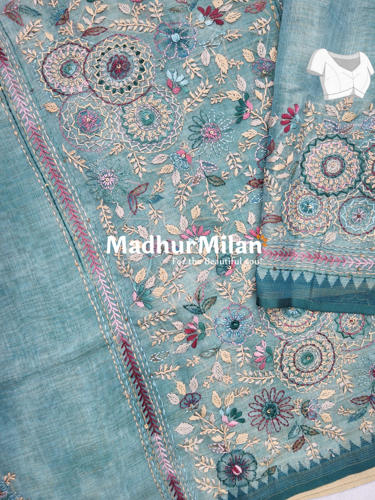 Description: Immerse yourself in the ethereal beauty of our LENIN TISSUE EMBROIDERY WORK SAREE in a captivating Dusty Rama shade. This exquisite saree is a masterpiece of artisanal craftsmanship, perfect for those who appreciate fine details and timeless elegance.
