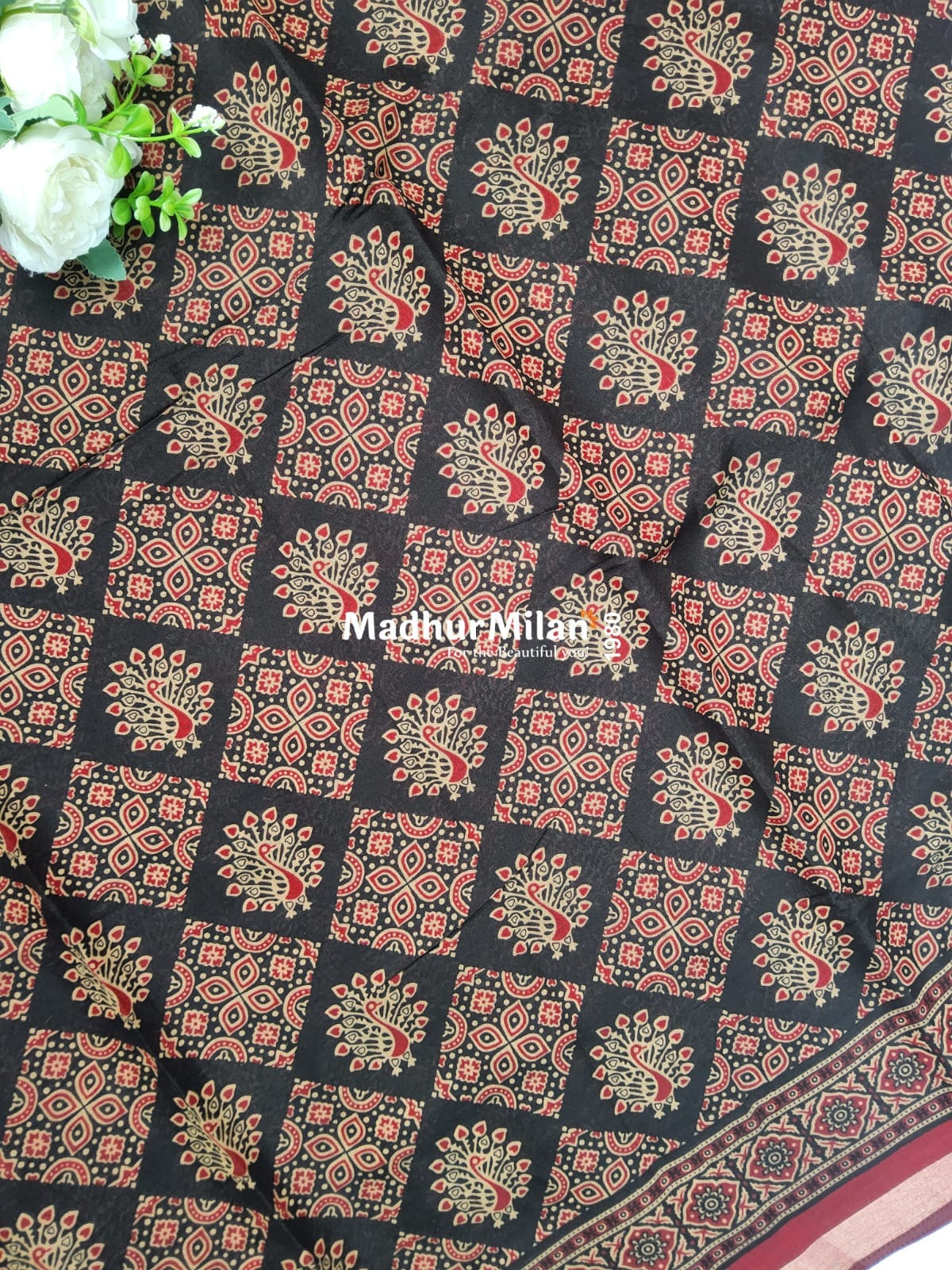 Product Description: AJRAK PRINT KAJU SILK SAREE BLACK