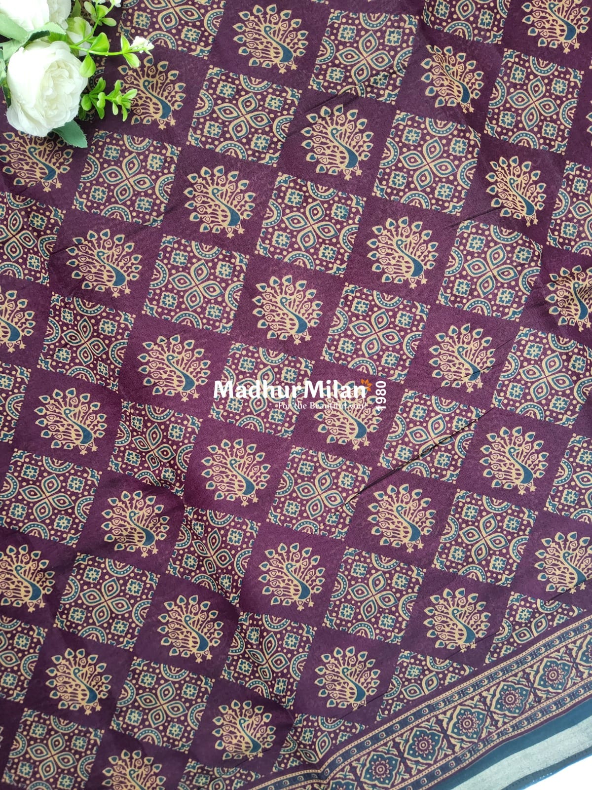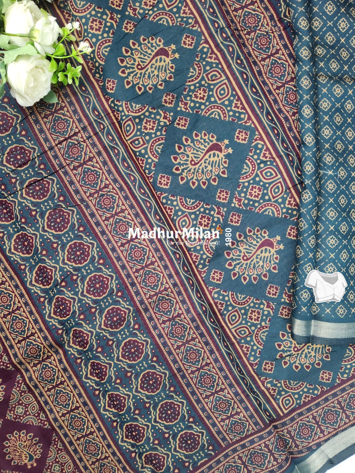 The saree showcases a mesmerizing array of peacock motifs arranged in a checkered pattern across the body. Each peacock design is meticulously block-printed, displaying the skilled craftsmanship of Ajrak artisans. The rich wine-colored background beautifully complements the golden and turquoise accents of the print. The border and pallu feature a striking blue shade, adorned with more elaborate Ajrak patterns including floral designs, mandala-like circles, and intricate geometric shapes.