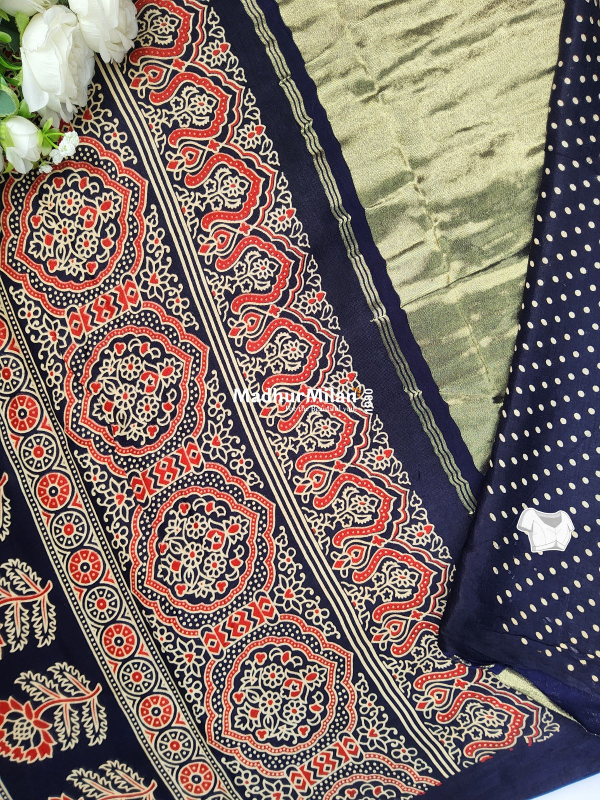 Product Description: AJRAKH PRINT GAJI MODAL SAREE BLACK