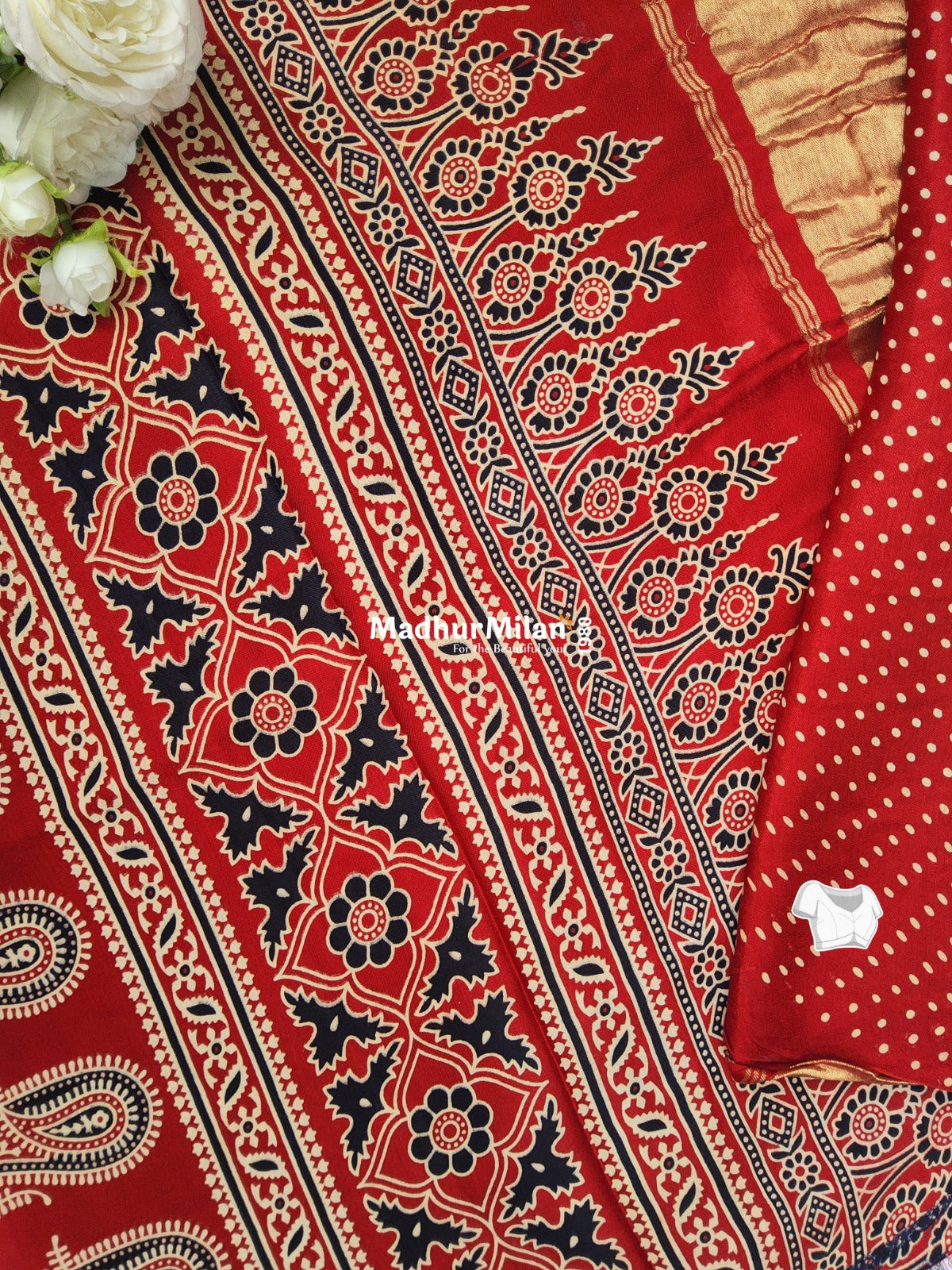 Product Description: AJRAKH PRINT GAJI MODAL SAREE RED