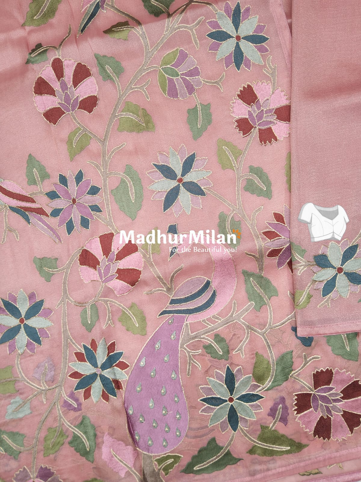 Versatility: Suitable for weddings, festivals, and special events This saree showcases the mastery of Ari embroidery, with delicate stitching bringing to life a enchanting garden scene. The dusty peach base provides a soft, feminine backdrop for the vibrant embroidery work. Flowers in various shapes and sizes, along with detailed leaves and stems, create a lush, organic pattern across the fabric. A charming bird motif adds a whimsical touch to the design. The intricate embroidery work extends to the border, ensuring a cohesive and luxurious look from every angle. The tissue organza fabric offers a subtle sheen and floaty drape, making it perfect for both day and evening wear.