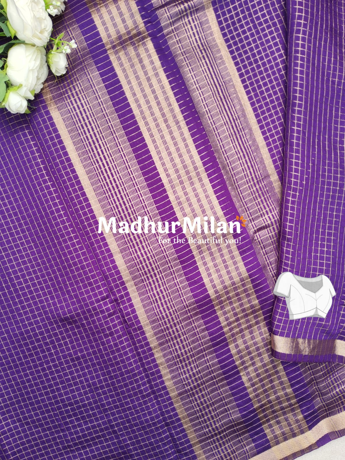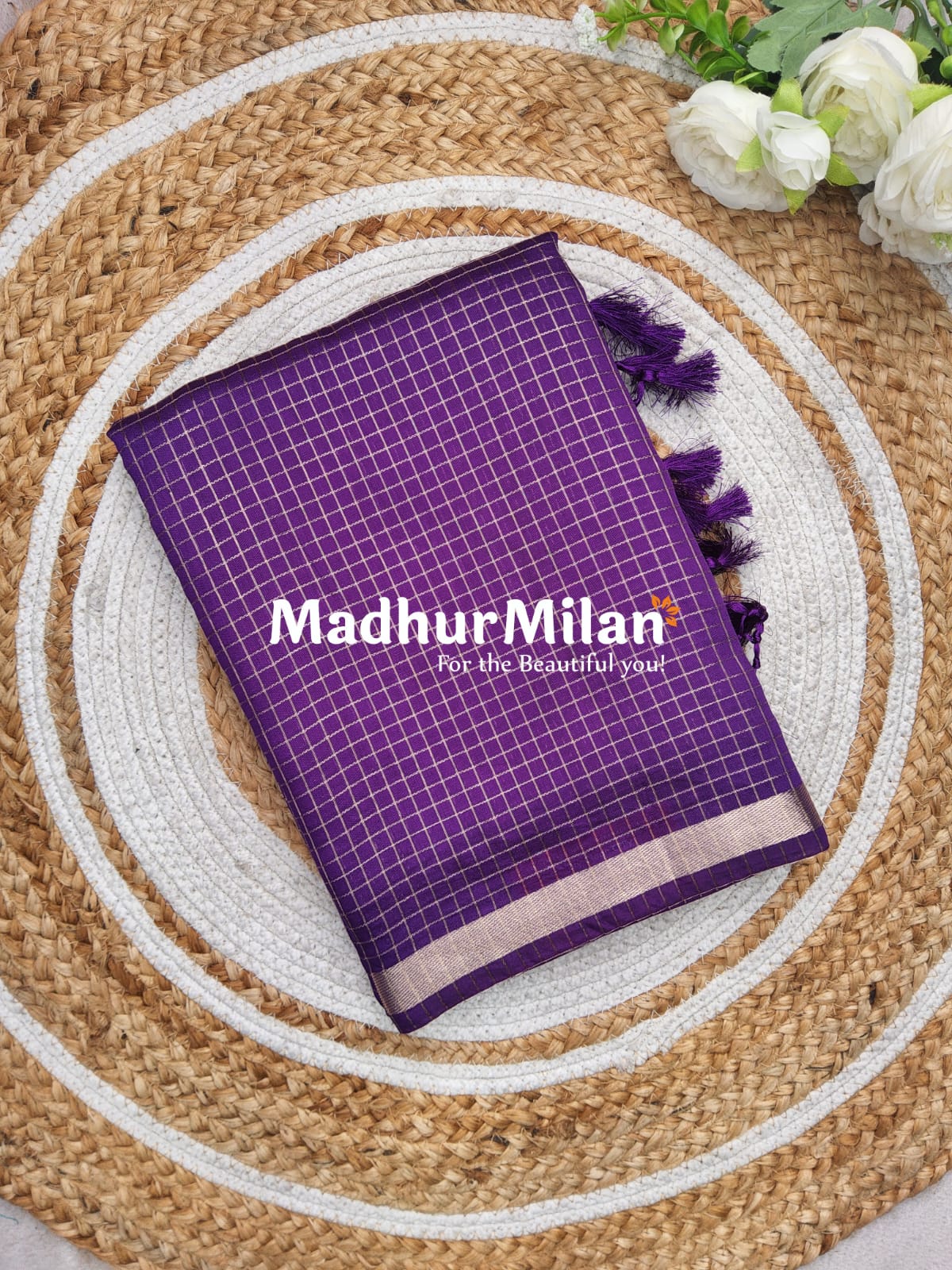 Madhur Milan brings you this beautiful saree, living up to their tagline "For the Beautiful you!" Make a statement at your next event with this elegant ASSAM SILK MINI CHECKS SAREE in purple.