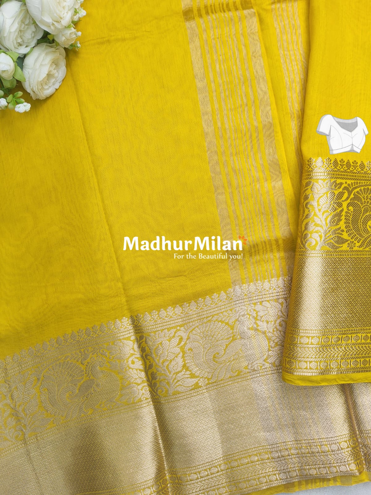Description: Elevate your ethnic wardrobe with this exquisite Dispur Silk Saree from Madhur Milan. This stunning yellow saree is a perfect blend of tradition and elegance, designed to make you stand out at any occasion.
