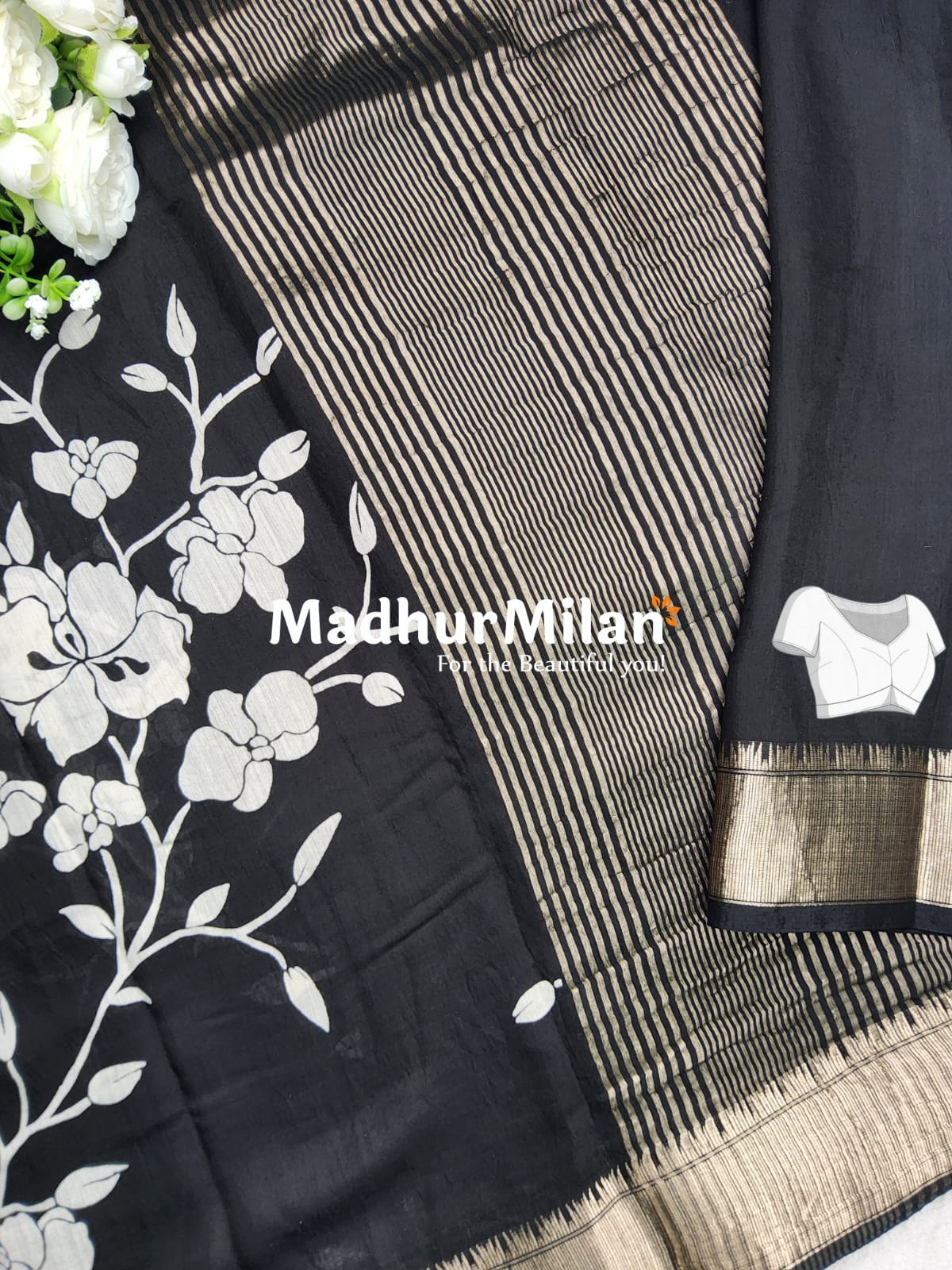 The saree showcases a beautiful floral print with delicate white blooms and leaves spread across the deep black background, creating a sophisticated and eye-catching contrast. The golden zari border adds a touch of opulence, making it perfect for special occasions. The pallu features an intricate striped pattern in gold and black, providing a stunning visual element when draped.