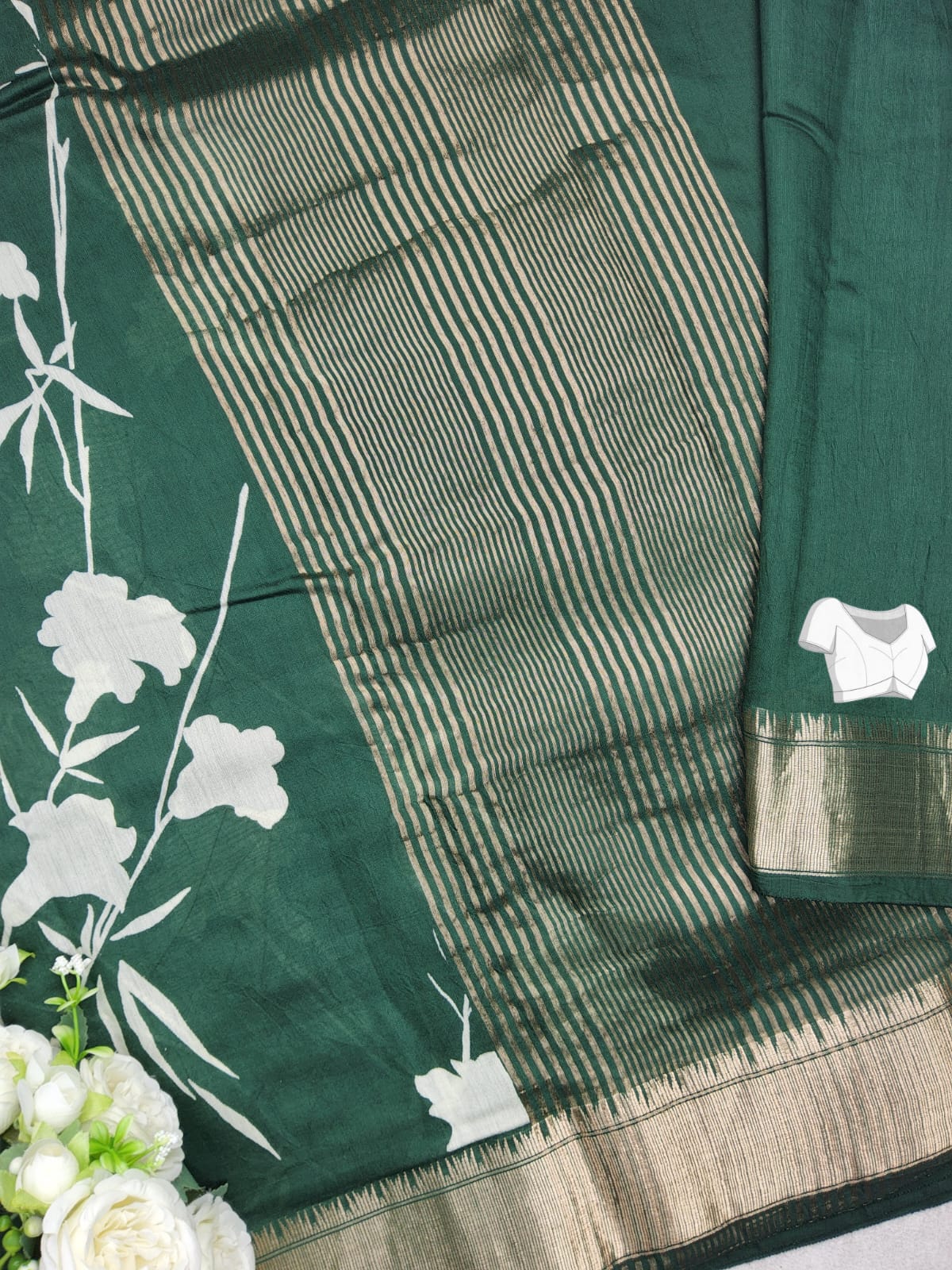 The saree showcases a mesmerizing deep green background adorned with delicate white floral prints, creating a striking contrast that's sure to turn heads. The large, flowing floral designs evoke a sense of natural beauty and grace, perfect for the modern, fashion-forward woman. The border of the saree is embellished with exquisite golden zari work, adding a touch of opulence to the overall design. The pallu features an intricate striped pattern in golden hues, creating a beautiful interplay of colors and textures.