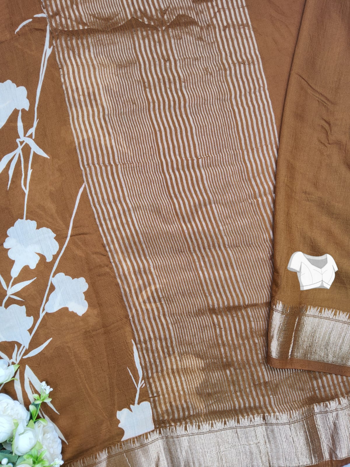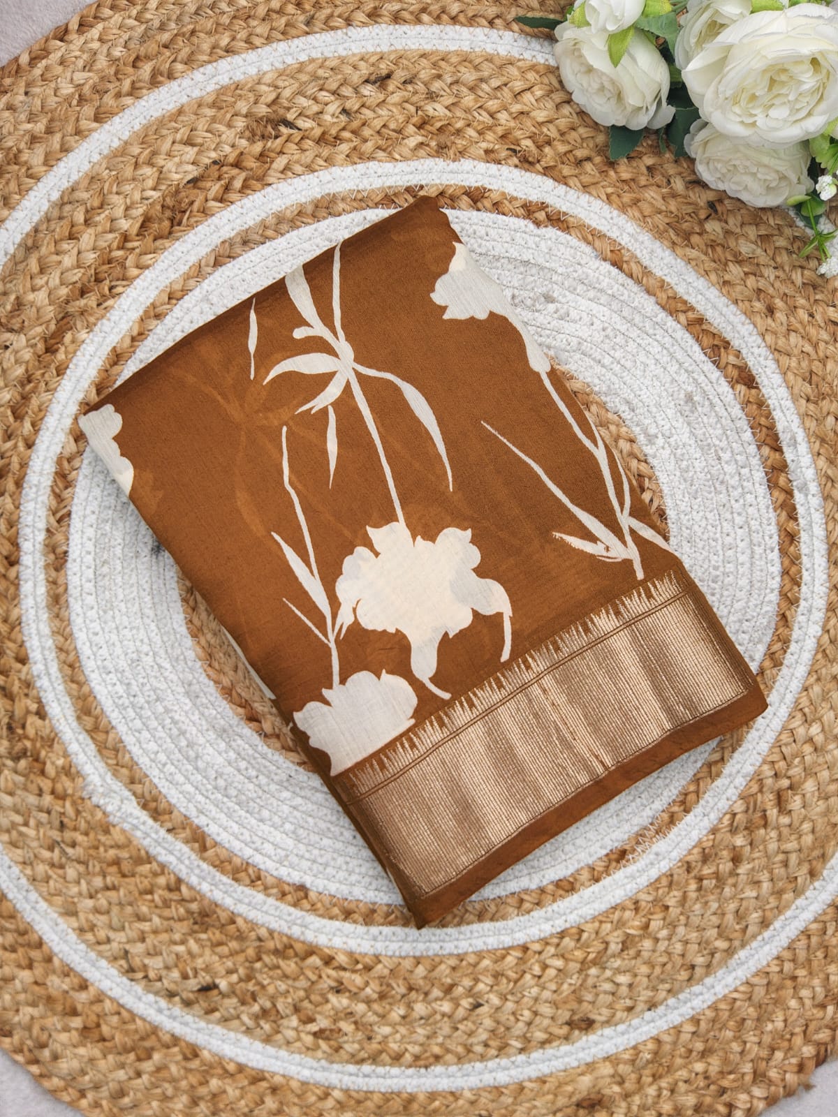 The saree showcases a beautiful contrast of white floral prints against a warm brown background, creating a sophisticated and eye-catching look.