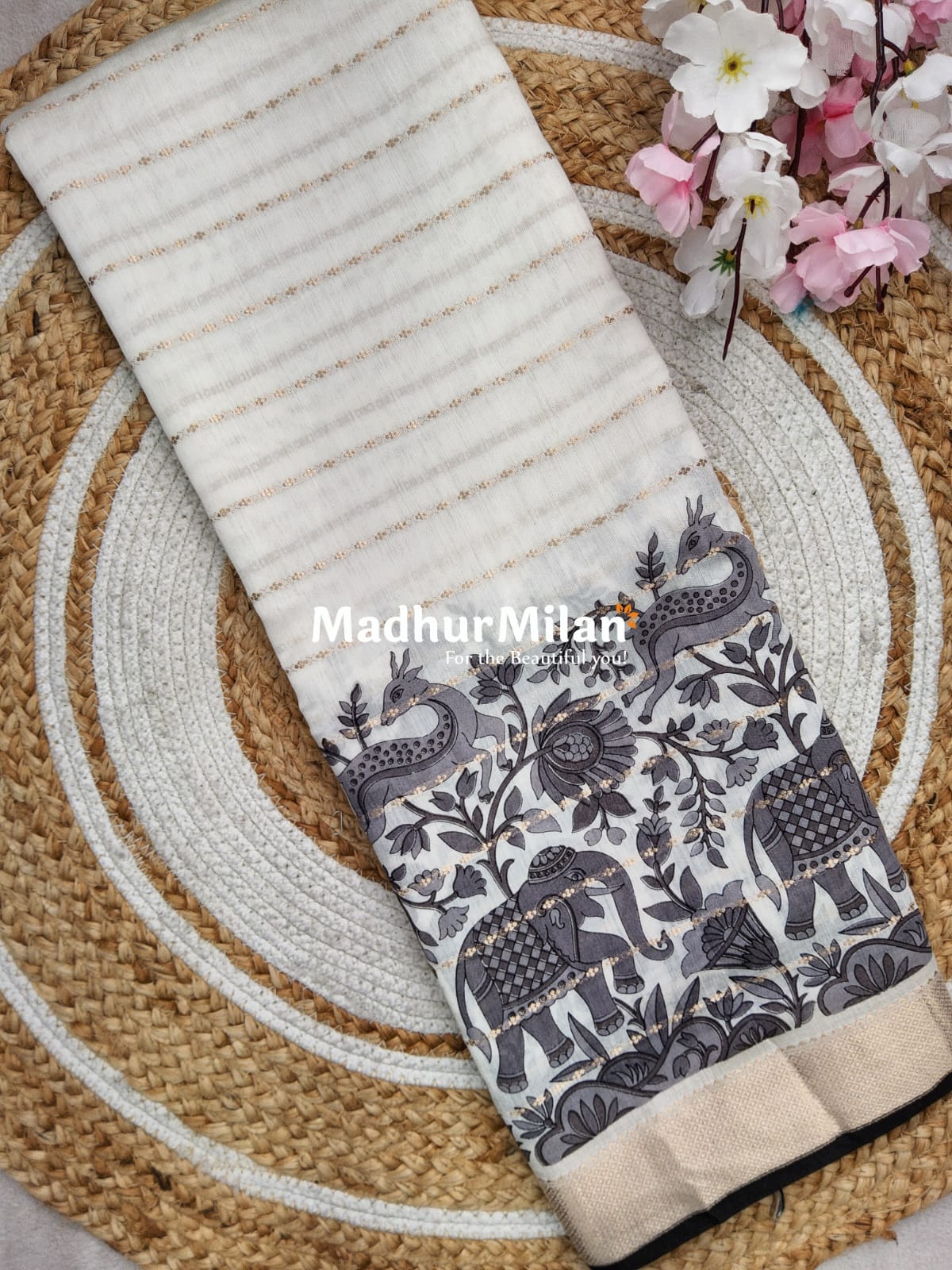 4. Striped Pattern: The body of the saree showcases elegant golden striped detailing, adding a touch of shimmer and luxury.