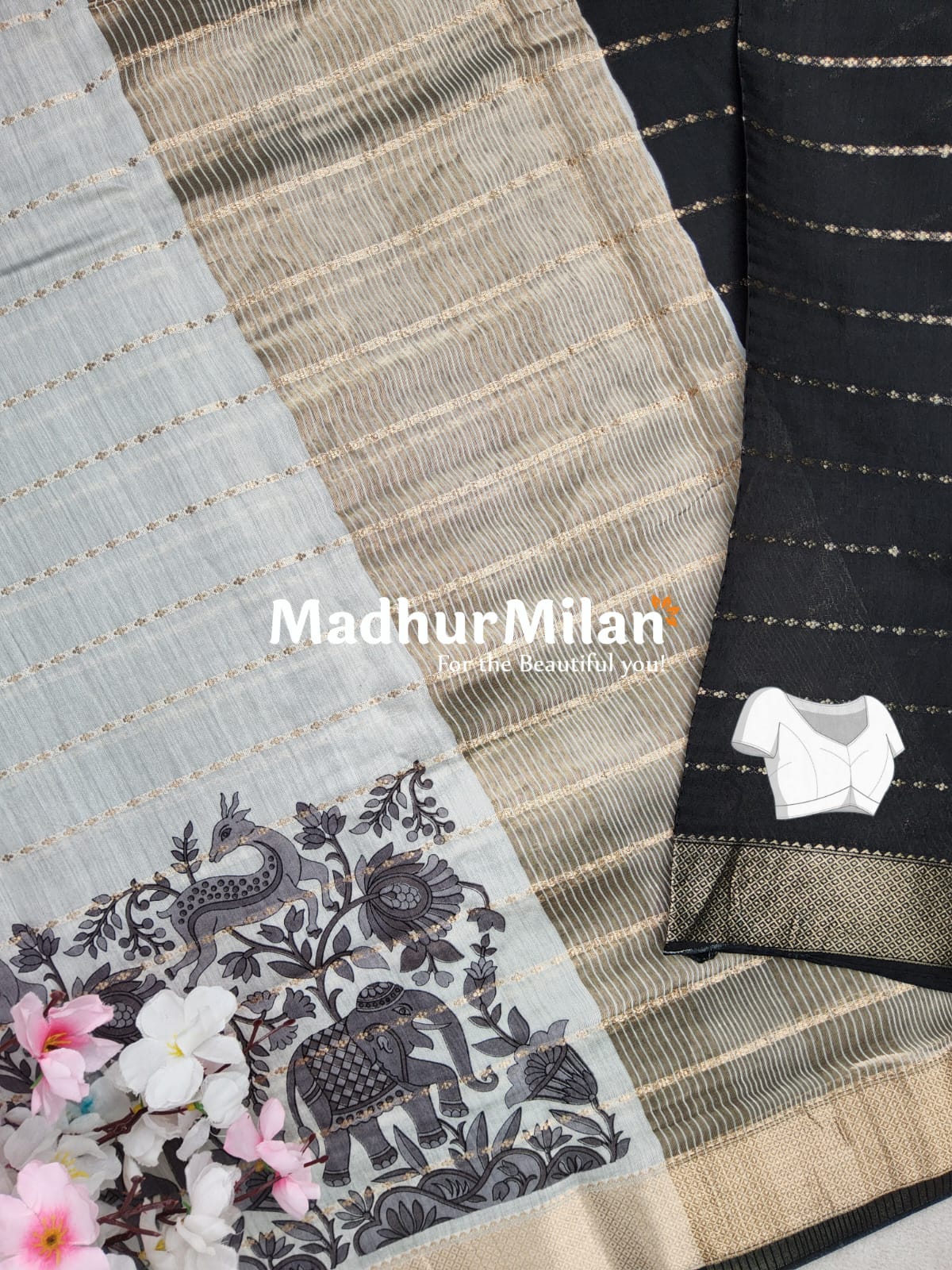 3. Unique Print: The saree features an eye-catching print with intricate designs of elephants, peacocks, and floral motifs in shades of gray, creating a beautiful contrast against the black background.