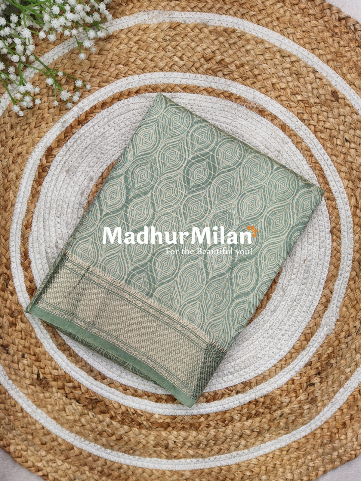 Description: Elevate your ethnic wardrobe with this exquisite Assam Silk Printed Saree in a soothing Dusty Pista shade.