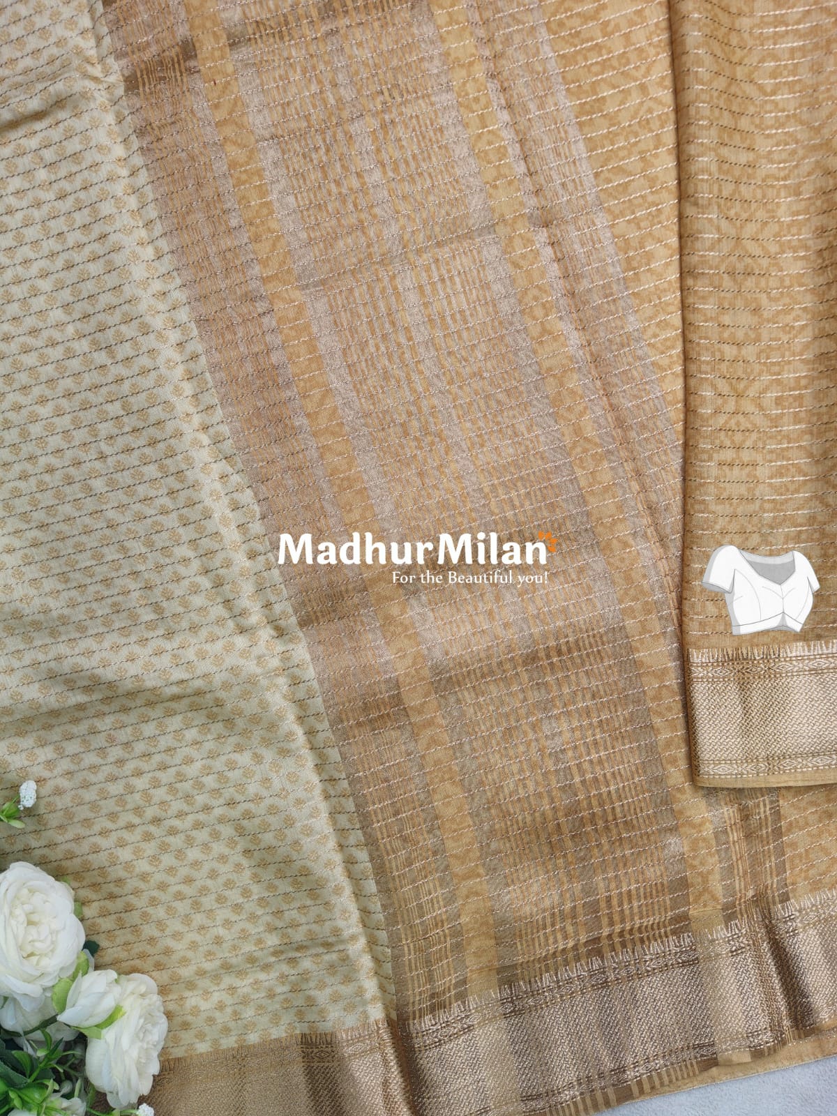 Craftsmanship: - The saree features a meticulous print work that showcases small, repeating motifs across the fabric. - The pallu displays an elaborate design, enhancing the saree's overall grandeur. - A broad golden zari border runs along the edges, perfectly complementing the dusty yellow base.