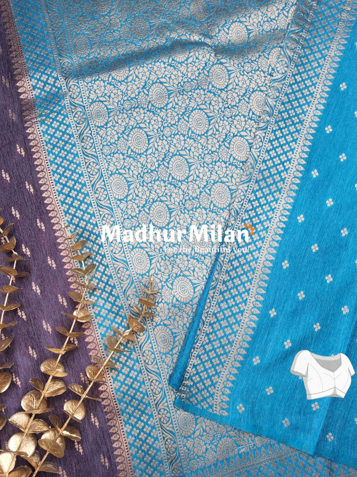 This BANARASI COTTON LOOMS IRON RAMA is a testament to the skilled artisans of Varanasi. The purple body is adorned with delicate golden motifs, reminiscent of twinkling stars, while the turquoise blue border and pallu provide a stunning contrast. The border features an array of traditional Banarasi patterns, including paisley motifs and intricate floral designs, all woven in shimmering golden zari. This saree is perfect for those who appreciate the grandeur of Banarasi weaves but prefer the comfort of cotton. It's an ideal choice for summer weddings, festivals, or any special occasion where you want to make a statement without compromising on comfort.
