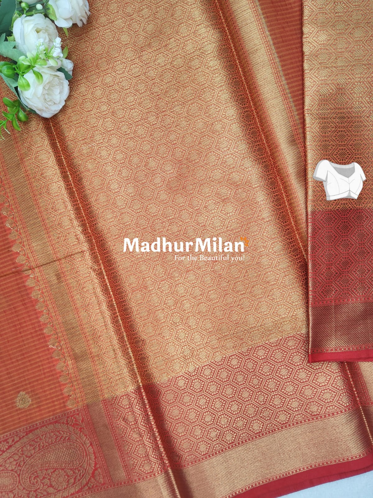 Description: Indulge in the timeless elegance of our exquisite Banarasi Kora Silk Saree in a stunning gold and red combination.