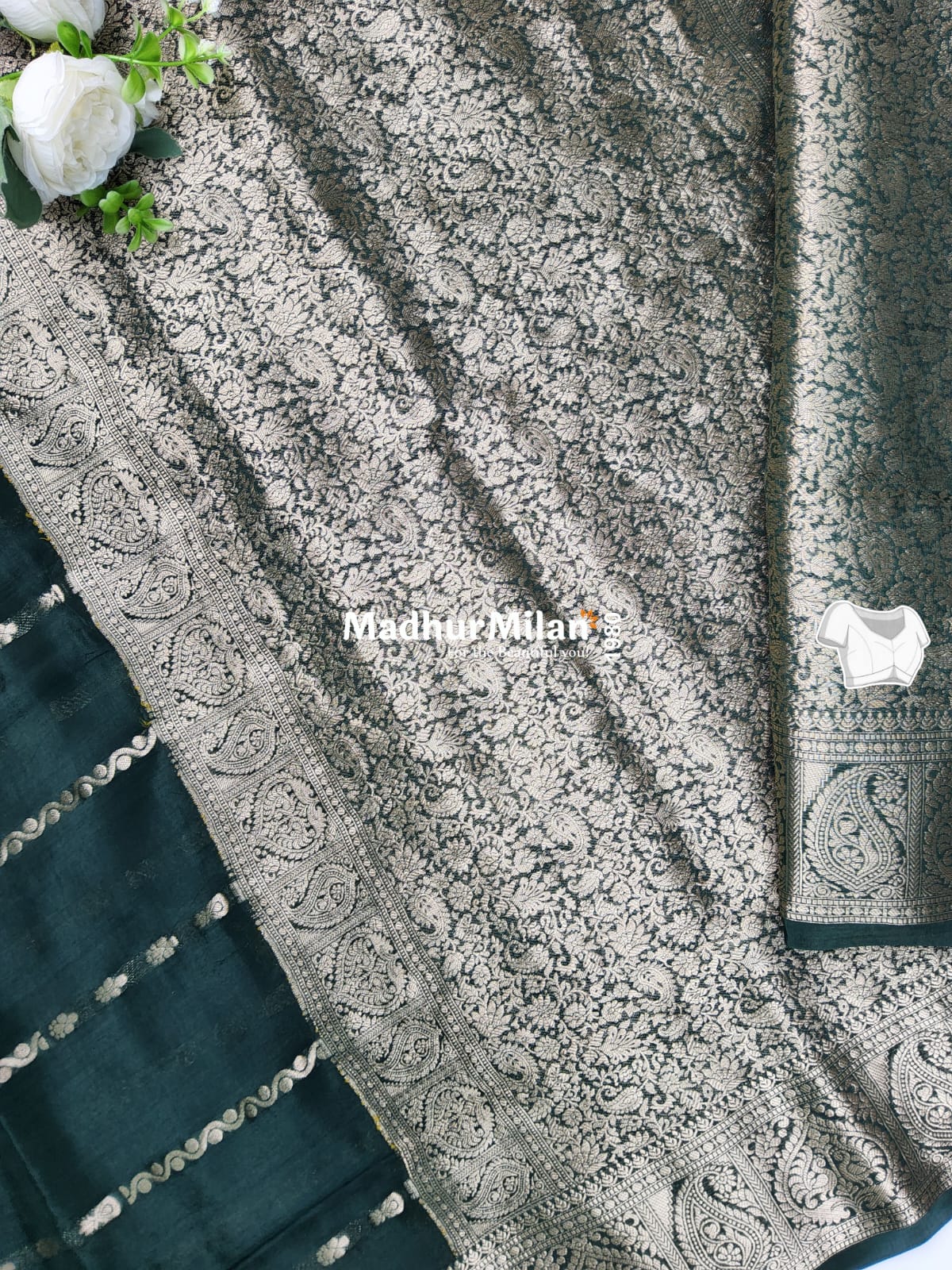 Color: Rich Dark Green with Golden zari work - Design: Intricate Banarasi patterns with paisley and floral motifs