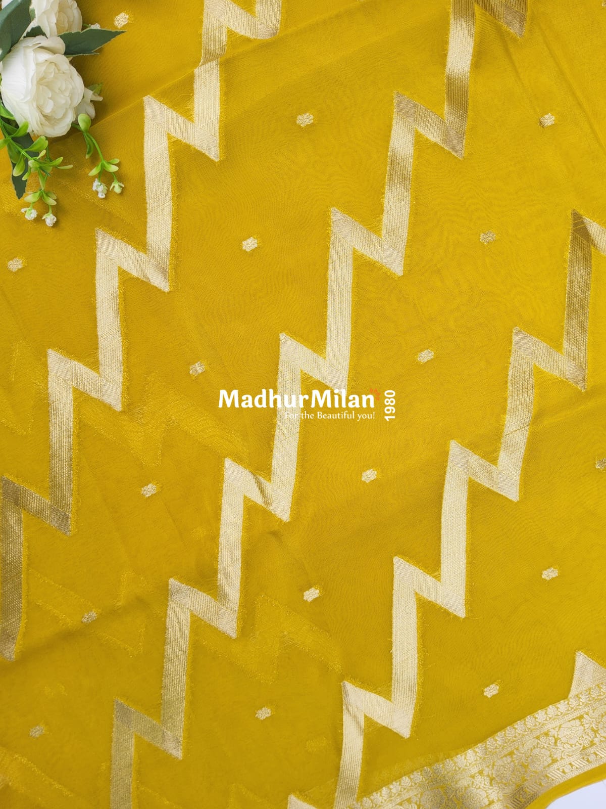 Product Description: Introducing the BANARASI ZIG ZAG RUSSIAN CREPE SAREE in a stunning Lemon Yellow shade, brought to you by Madhur Milan.