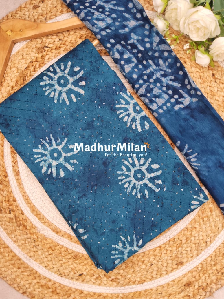 The suit features a beautiful batik print in shades of blue and white, showcasing artistic sun-like patterns that create a captivating visual effect. The intricate sequence work scattered across the fabric adds a subtle shimmer, perfect for special occasions or festive wear. This unstitched salwar suit allows you to tailor it according to your preferences and body measurements, ensuring a perfect fit every time.