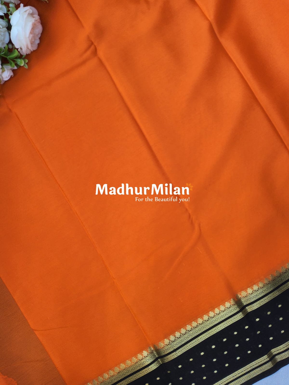 This BENTEX BUTTA BORDER PURE CREPE SILK SAREE is a perfect blend of traditional design and contemporary style. Its vibrant orange hue is sure to make you stand out, while the rich brown and gold accents add depth and sophistication to your look.