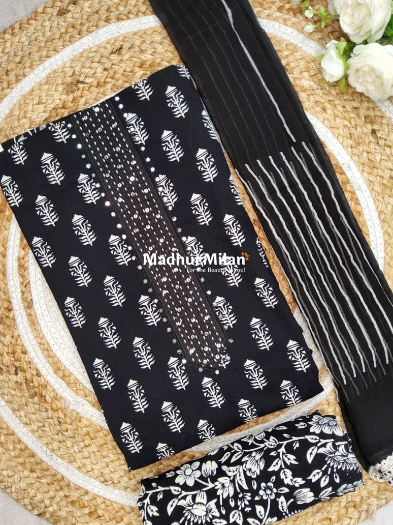Description: Elevate your ethnic wardrobe with our exquisite Black Beauty Cotton Unstitched Salwar Suit.