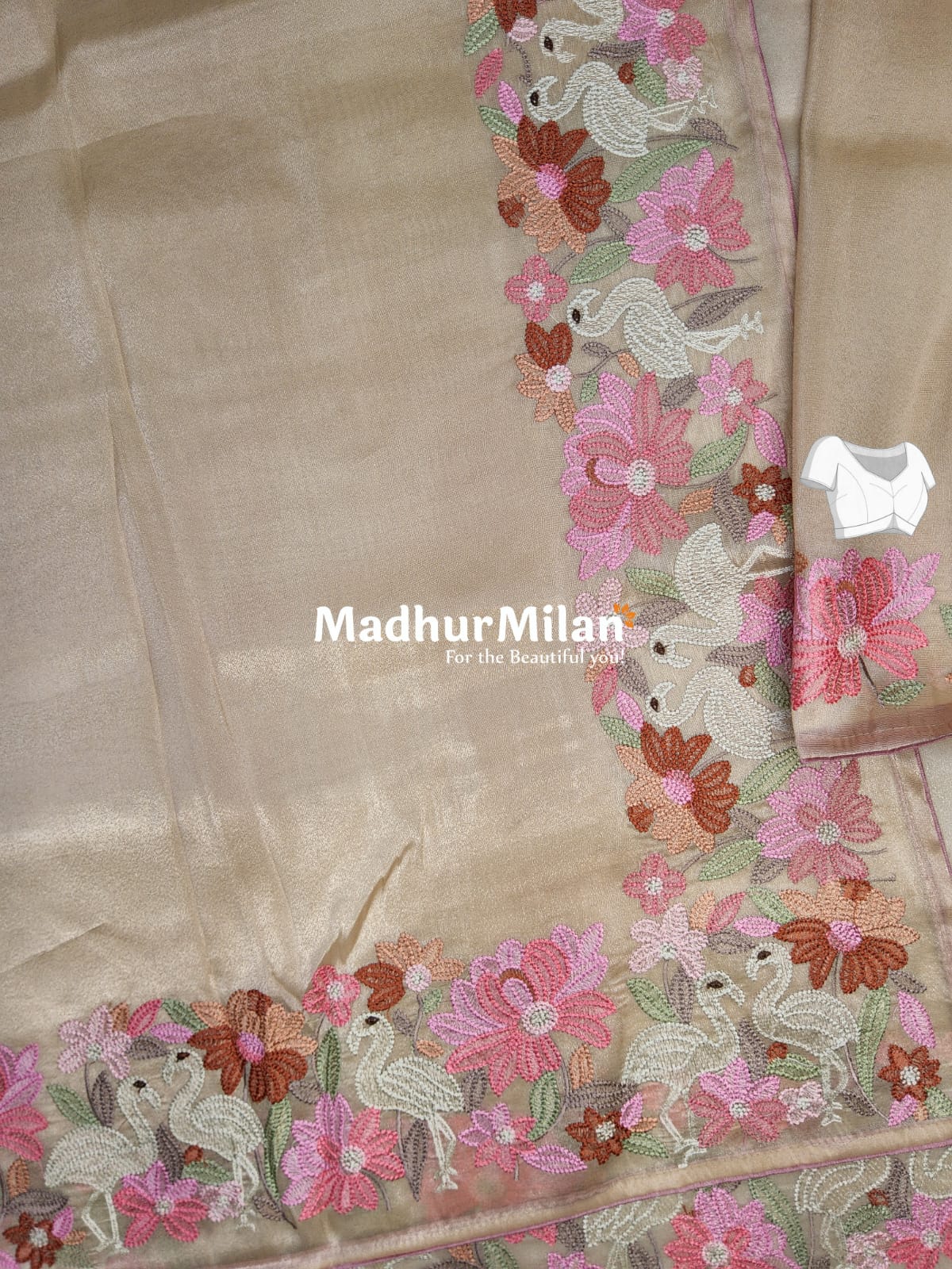 The saree showcases a mesmerizing interplay of colors and textures. The gold base provides a rich backdrop for the stunning embroidery work. The border features an array of intricately embroidered flowers in shades of pink, white, and brown, complemented by green leaves and charming bird motifs in white.