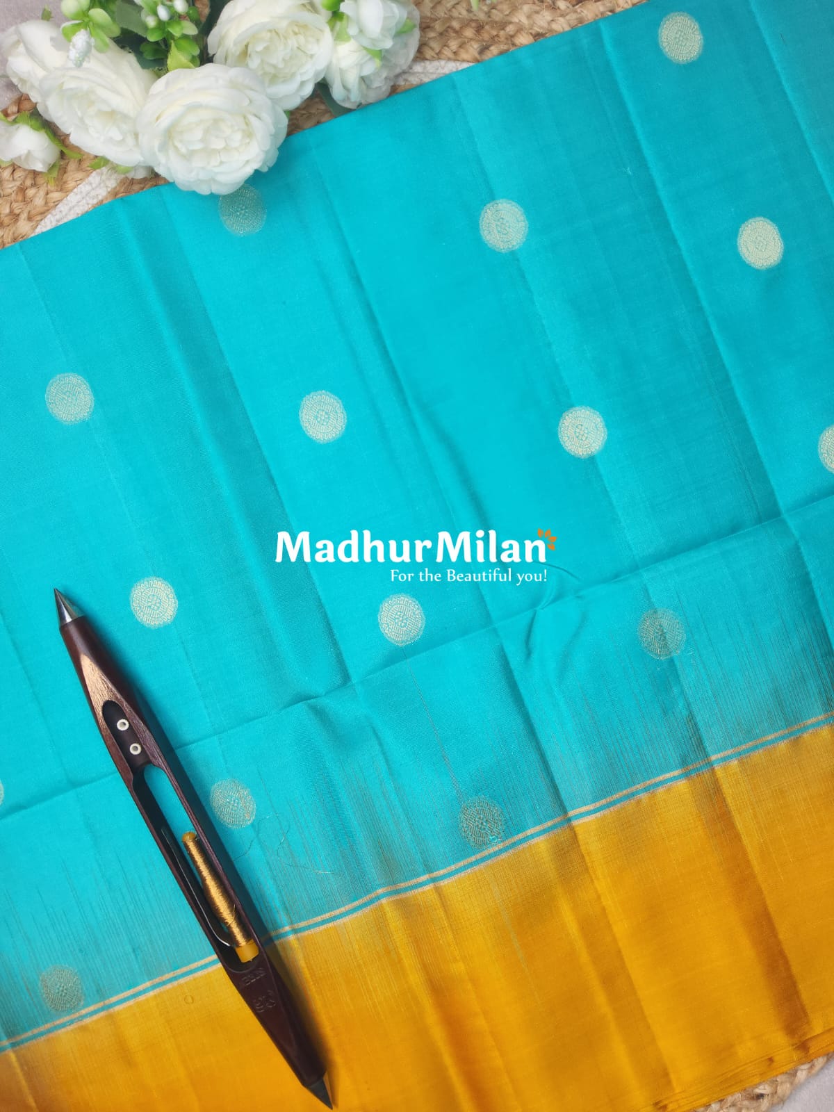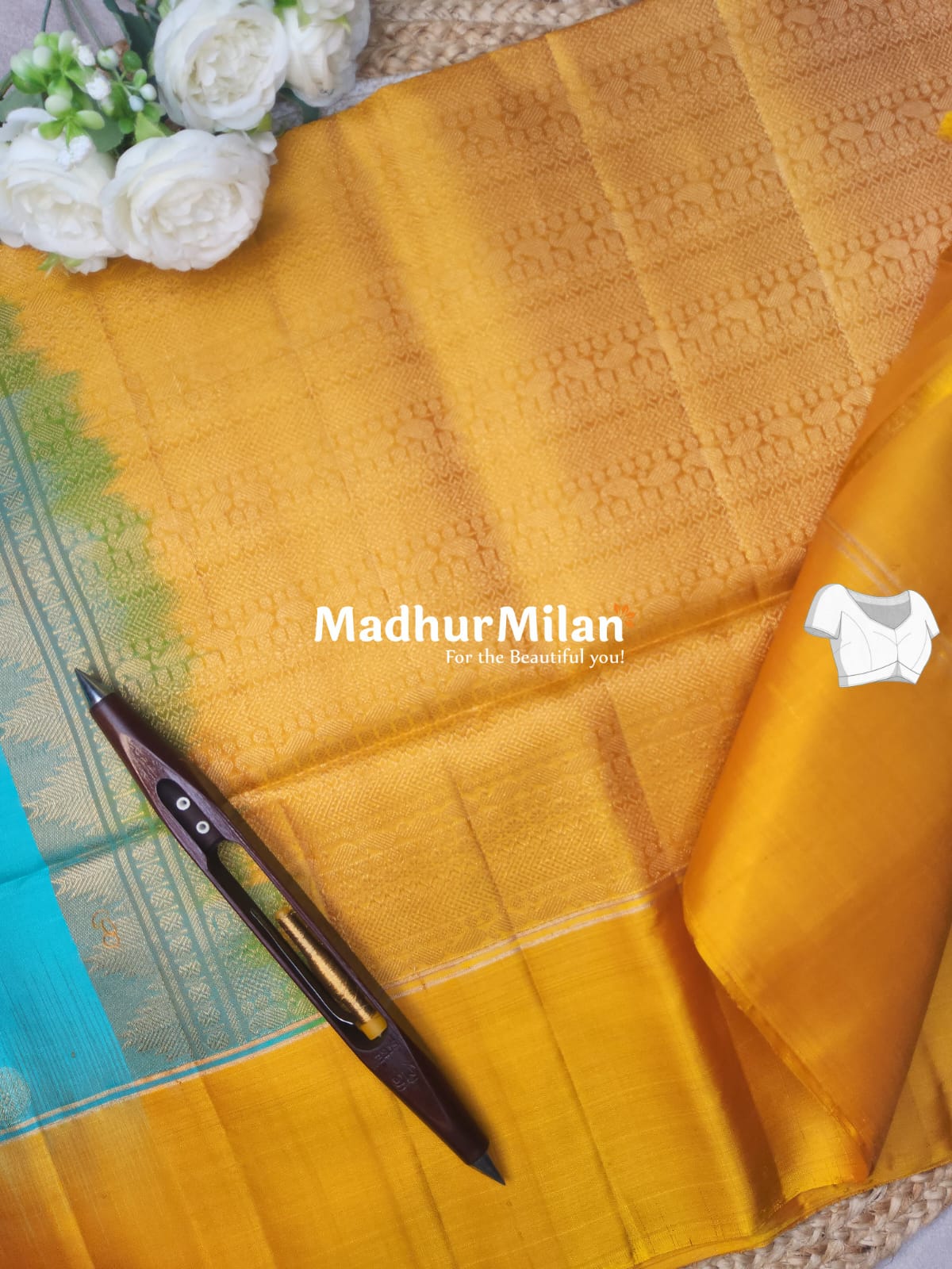 This Madhur Milan saree is a testament to timeless Indian craftsmanship, blending contemporary color choices with traditional designs. The contrast between the aqua body and mustard border creates a striking visual appeal that's sure to turn heads. Whether you're attending a wedding or hosting a festive gathering, this saree promises to make you stand out with elegance and grace.