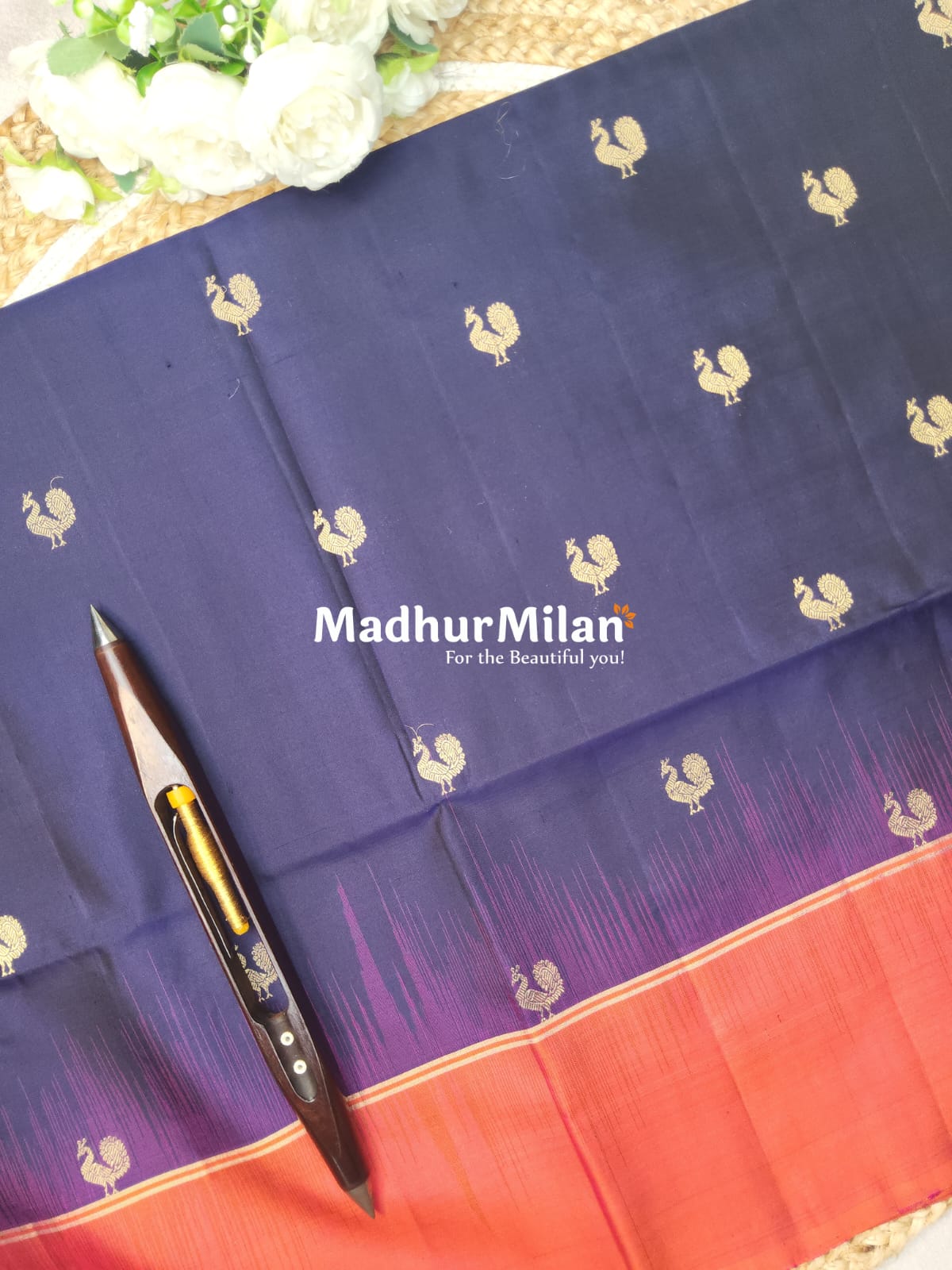 2. Dual-Tone Design: The saree showcases a striking combination of navy-blue body with a vibrant peach border and pallu.