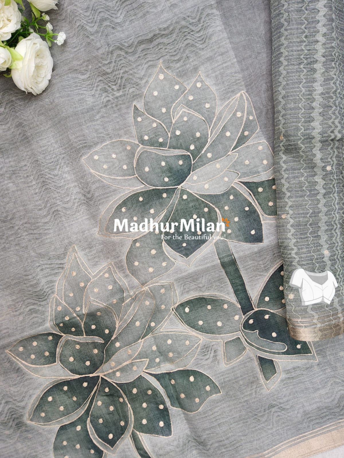 The saree showcases exquisite Ari work embroidery, with large lotus-like flowers intricately designed using cream-colored thread. The flowers are embellished with delicate dots, creating a mesmerizing contrast against the dusty green background. The body of the saree features a subtle chevron print, adding texture and dimension to the overall look.