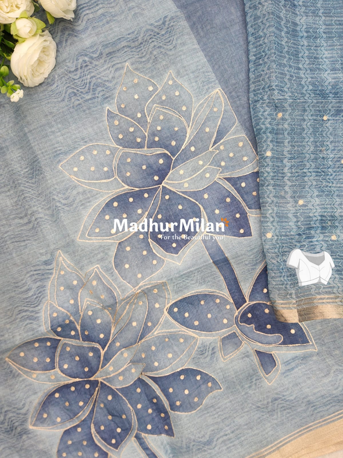 The saree showcases a beautiful interplay of shades, with the dusty grey base complemented by darker tones in the embroidered areas. The Ari work, executed in golden thread, creates a striking contrast against the muted background, featuring large lotus-like flowers and intricate dotted patterns within the petals.