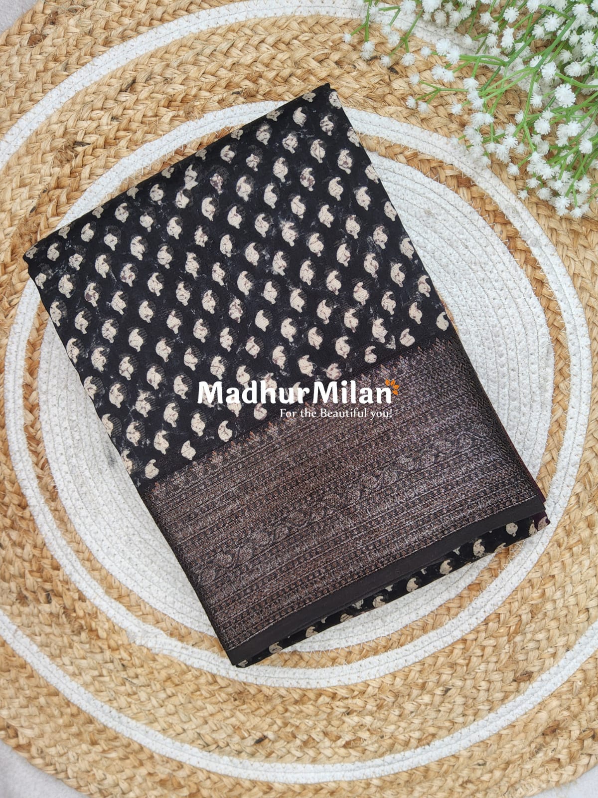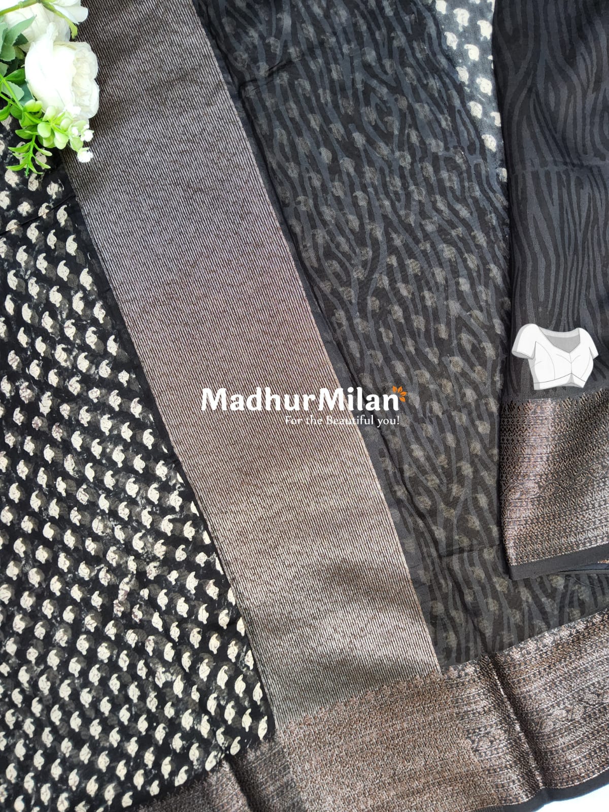 Description: Elevate your ethnic wardrobe with this exquisite Chanderi Printed Saree in Black from Madhur Milan.