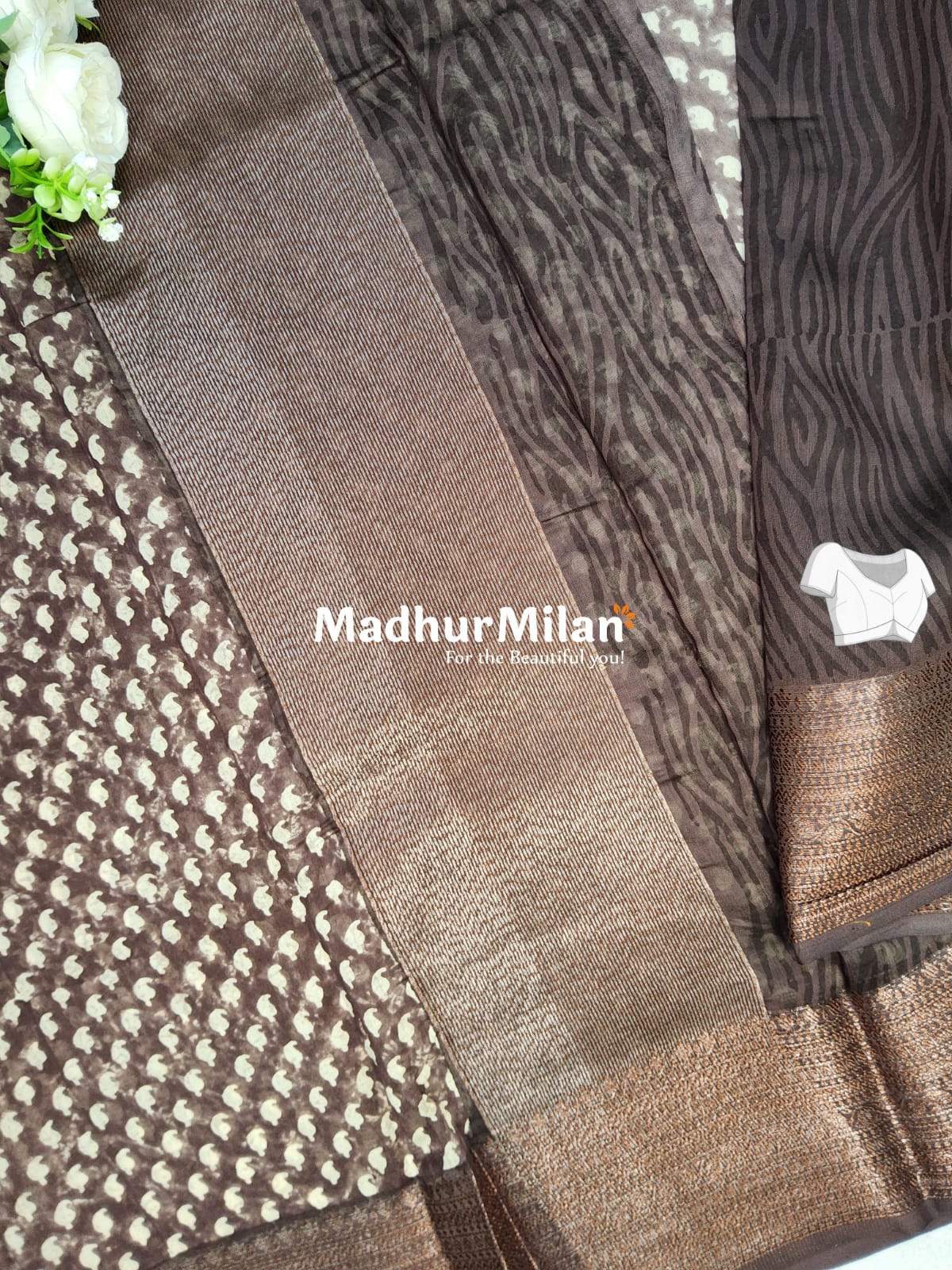 Description: Elevate your ethnic wardrobe with this exquisite Chanderi Printed Saree in a rich brown hue from Madhur Milan.
