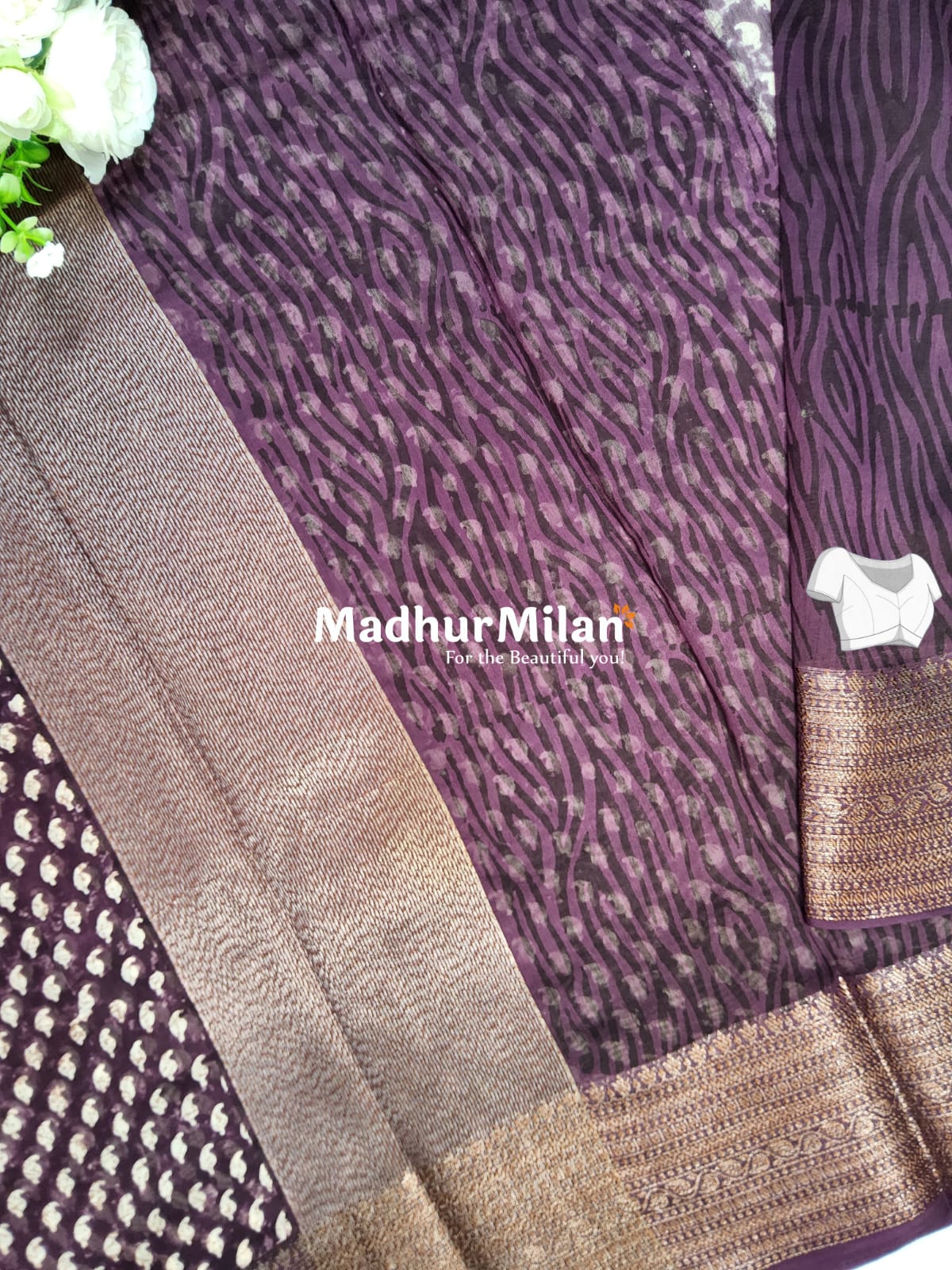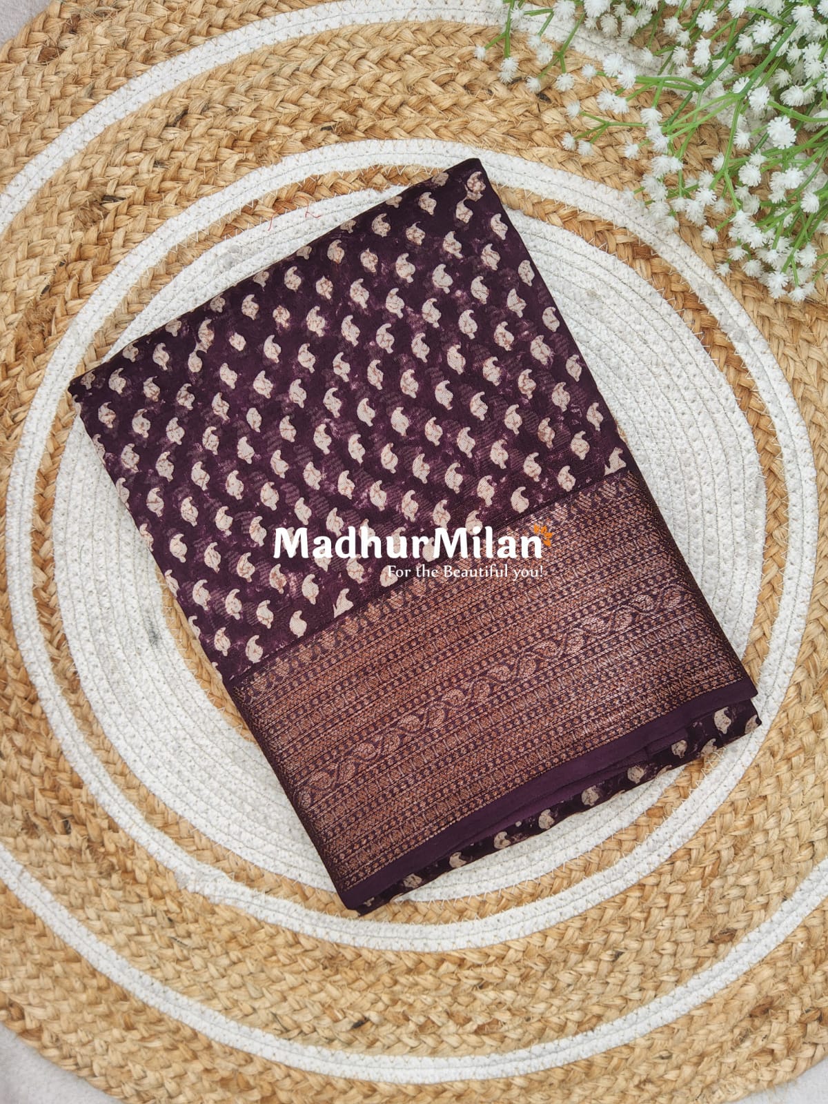 Description: Elevate your ethnic wardrobe with this exquisite Chanderi Printed Saree in a rich wine hue from Madhur Milan.
