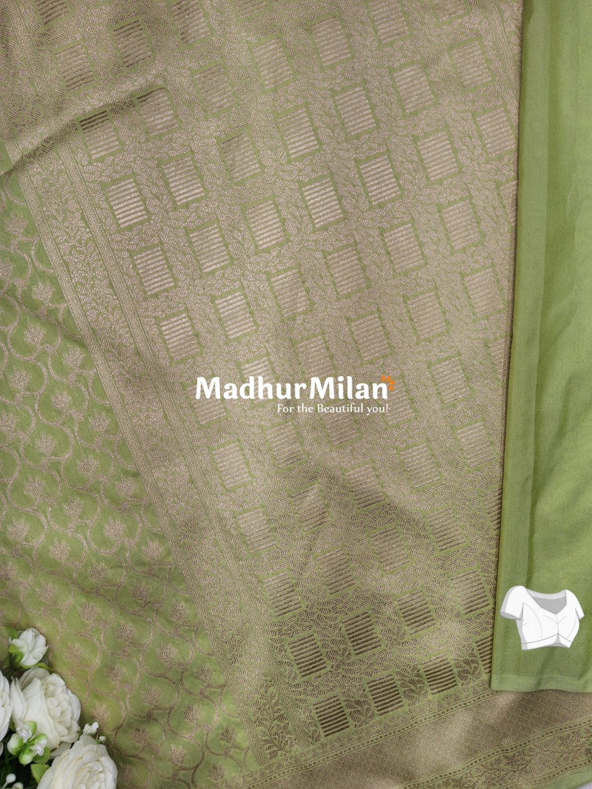 Elevate your ethnic wardrobe with the exquisite CHARVI Banarasi Crepe Silk Saree in a soothing sage green hue.