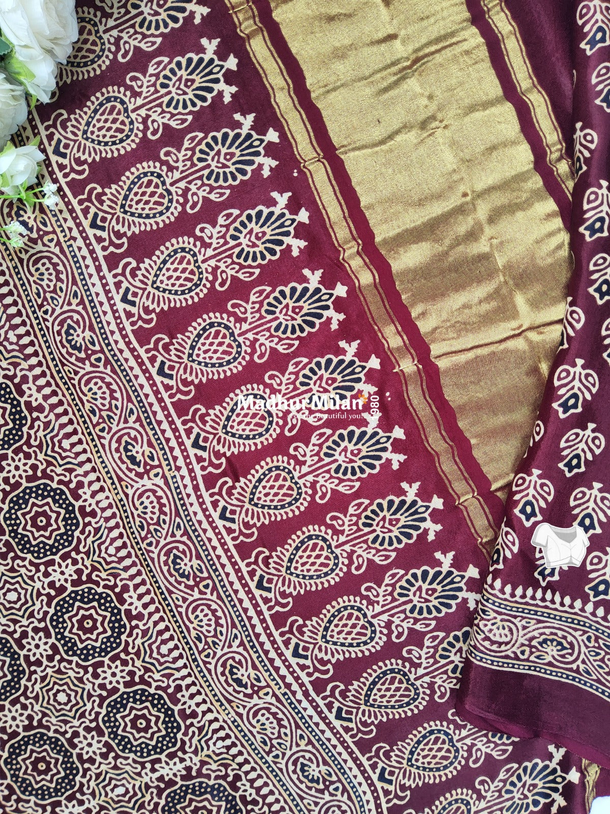 This exquisite saree showcases the timeless beauty of Ajrakh print, a centuries-old art form, reimagined in a contemporary checks pattern. The rich brown base color is adorned with intricate geometric and floral motifs in gold, creating a mesmerizing visual tapestry.