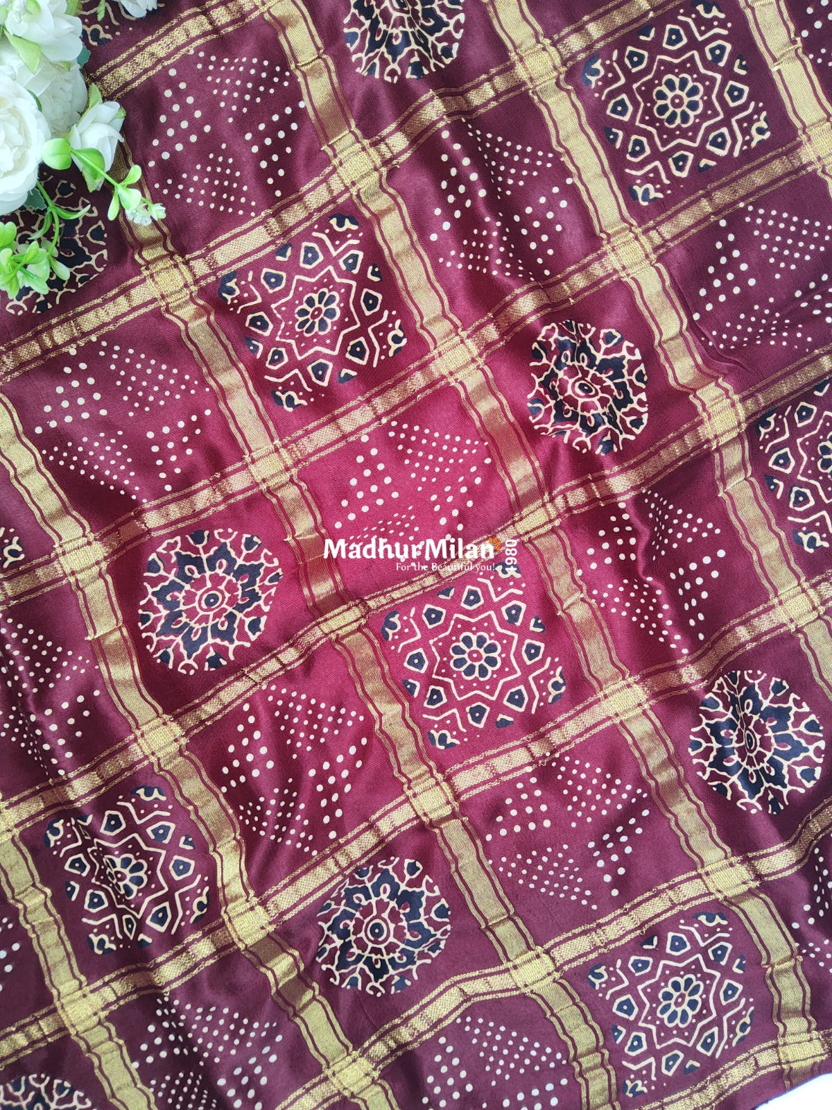 Product Description: Introducing the CHECKS AJRAKH PRINT GAJI MODAL SAREE BROWN - a stunning blend of tradition and elegance from Madhur Milan.