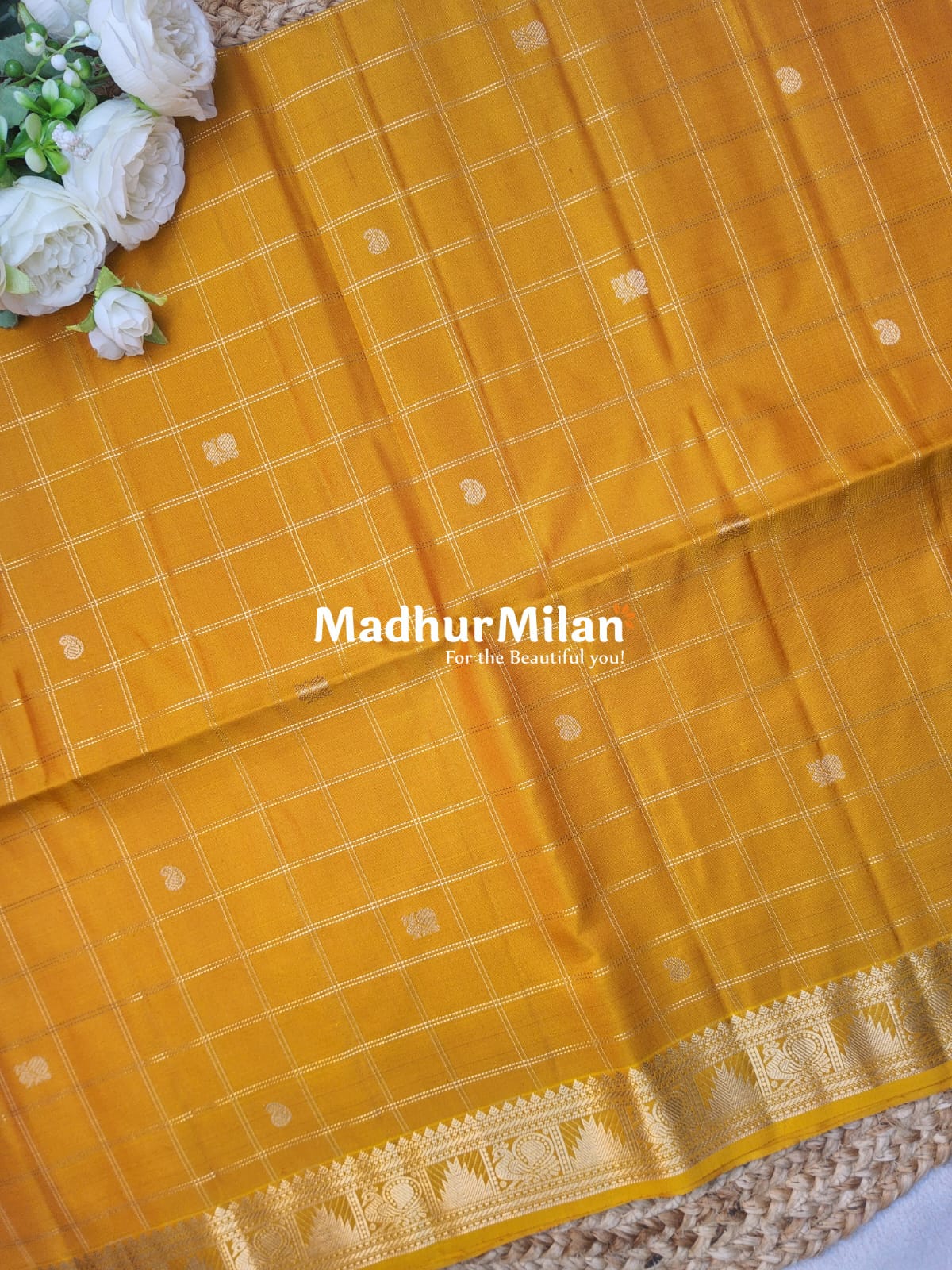 Pattern & Weave: - The body features a classic check pattern with small, subtle butta motifs woven within each square. - The border and pallu showcase exquisite zari work with traditional Indian motifs.