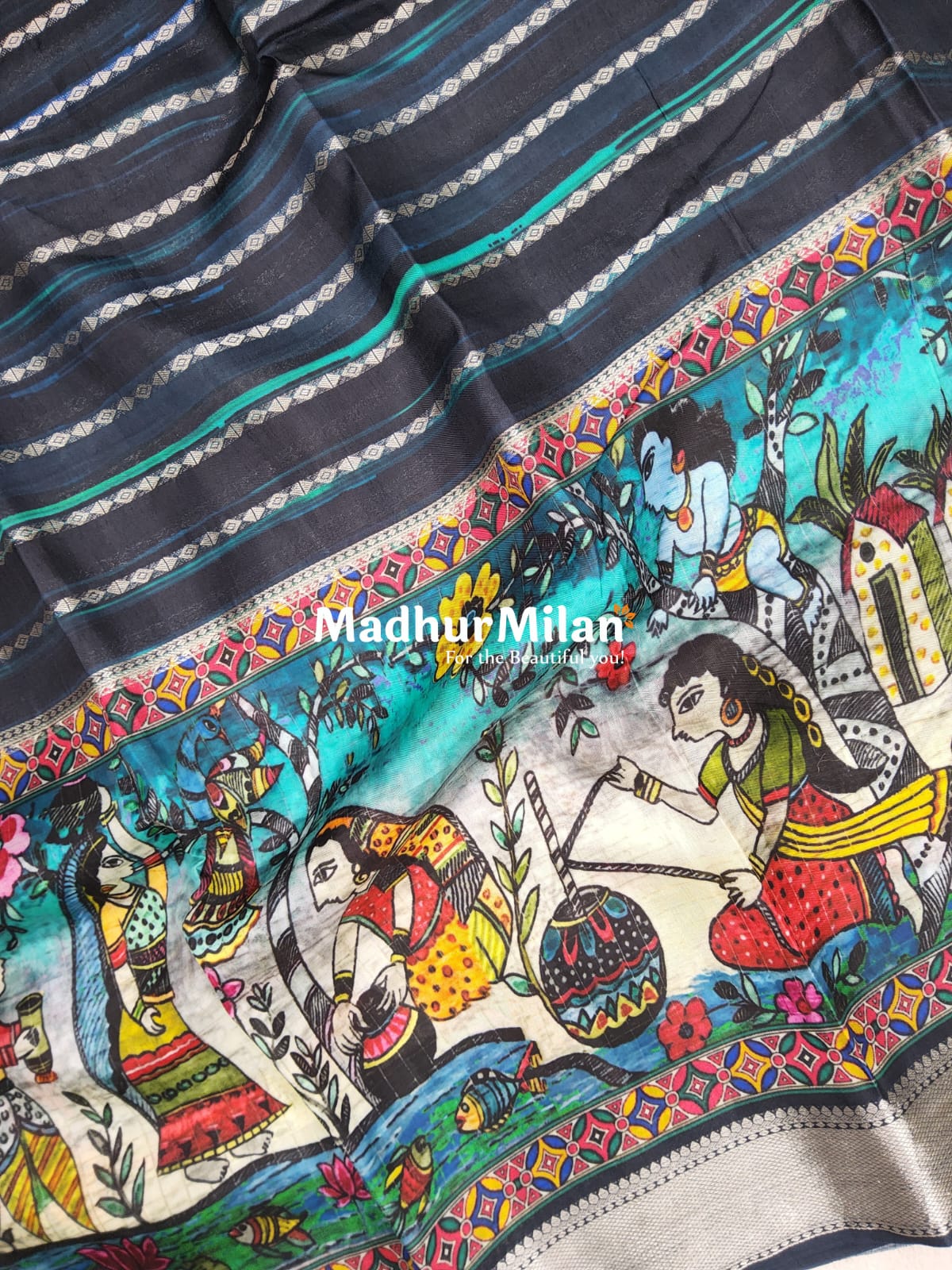 4. Artwork: The saree showcases exquisite hand-painted style illustrations depicting village scenes, flora, and fauna, bringing the rich tapestry of Indian culture to life.