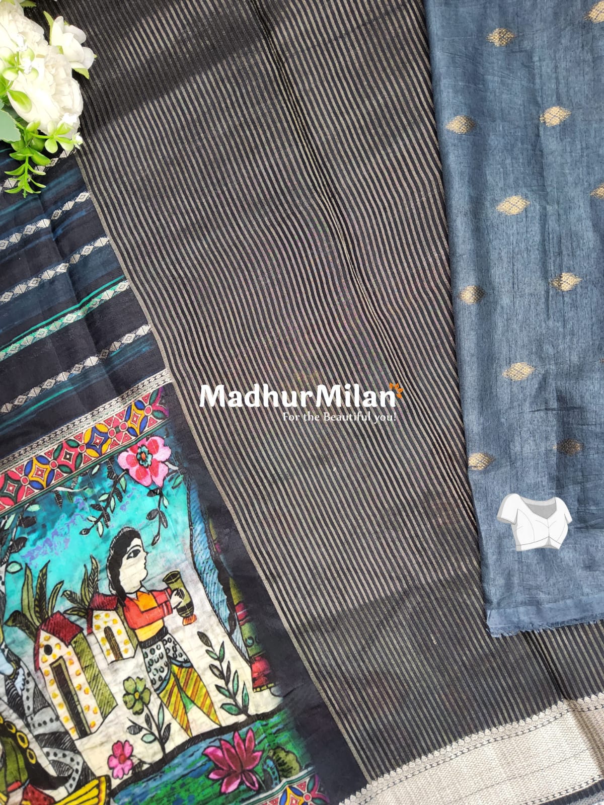 3. Design: - Body: Deep grey with subtle silver striped pattern - Border: Striking aqua blue adorned with intricate Madhubani-style artwork -