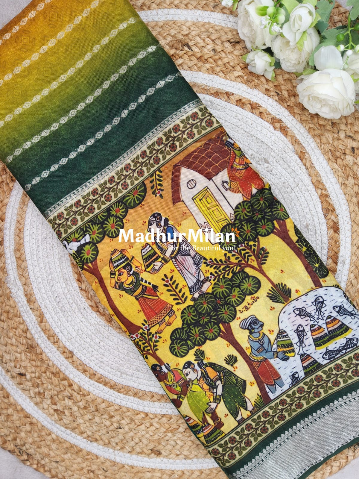 Immerse yourself in the rich tapestry of Indian culture with our exquisite CHITRA PRINTS CREPE SAREE in stunning gold and green hues.