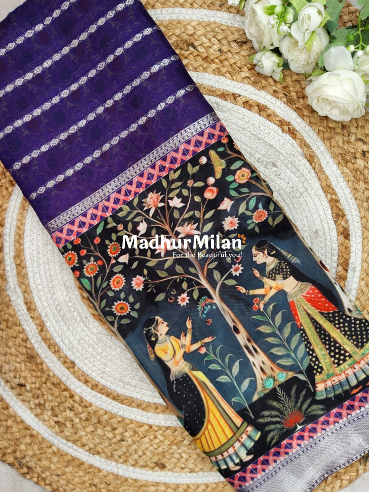 3. Design: - Body features diagonal silver stripes on a purple-grey background - Intricate floral motifs scattered across the purple fabric - Stunning pallu with a vibrant, colorful scene depicting traditional Indian art - Detailed border with pink and silver geometric patterns Pallu Highlights: The Body showcases a breathtaking scene with a flowering tree, colorful figures in traditional attire, and intricate floral designs. This artistic masterpiece adds a touch of cultural richness to the saree.